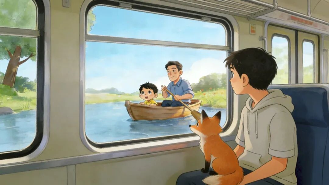 那个船上的父亲看了我一眼,温柔地笑了一下,然后继续摇船。那个“我”还在叽叽喳喳,我小时候便是那样的。是我的错觉吗?我也笑了。