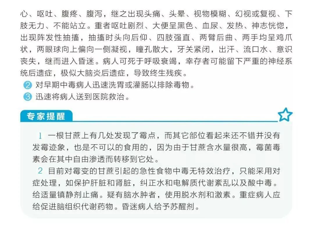 医生提醒,一旦发现甘蔗霉变,要整根丢弃,切勿抱有侥幸心理食用未发霉部分,因为毒素会渗透到甘蔗各个部位,肉眼无法察觉,在商家削皮时一定要注意看甘蔗瓤部,如果是红心的,最好不要购买。另外,不明来源的甘蔗汁最好不要饮用。
