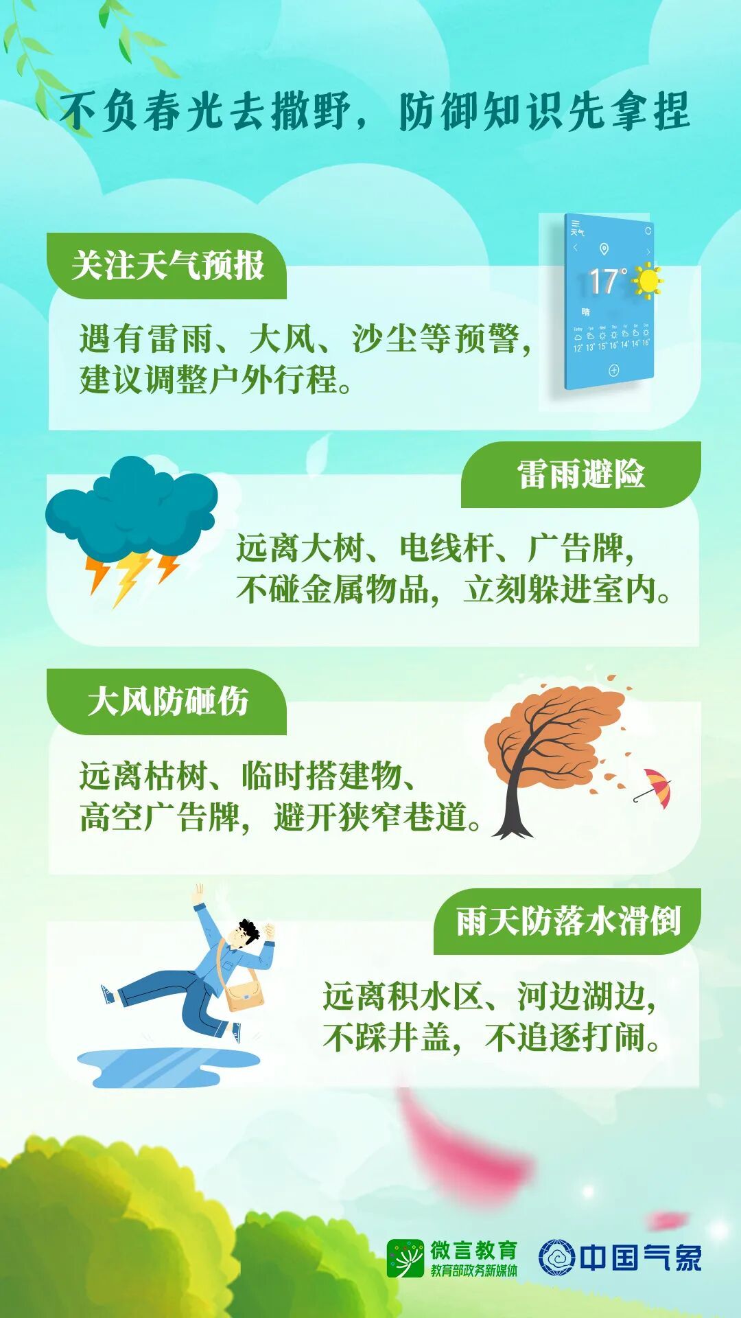 春光正好,草木欣然,正是踏青出游、亲近自然的好时节。@微言教育联合@国气象推出春日安全知识,伴你平安“赴春”——
