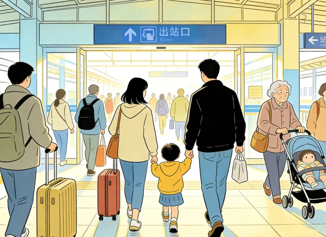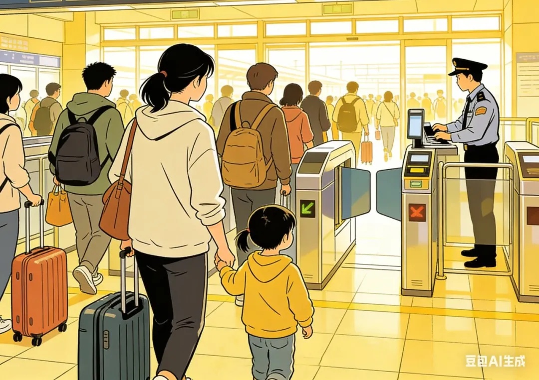 若确需通过自动闸机,务必将孩子抱起或紧紧牵在身侧,与家长同步刷证、同步通行,切勿让孩子单独过闸。检票后有序前往站台,不催促、不奔跑、不拥挤,避免孩子在通道内摔倒走失。