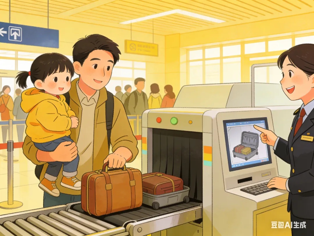 过安检时,优先让孩子先通过安检门,在对面等候,家长再通过安检。切勿让孩子独自在安检区域停留、乱跑。过检后及时清点行李,确认所有物品收纳完毕后,再带孩子快速离开安检区域,不在通道内停留。