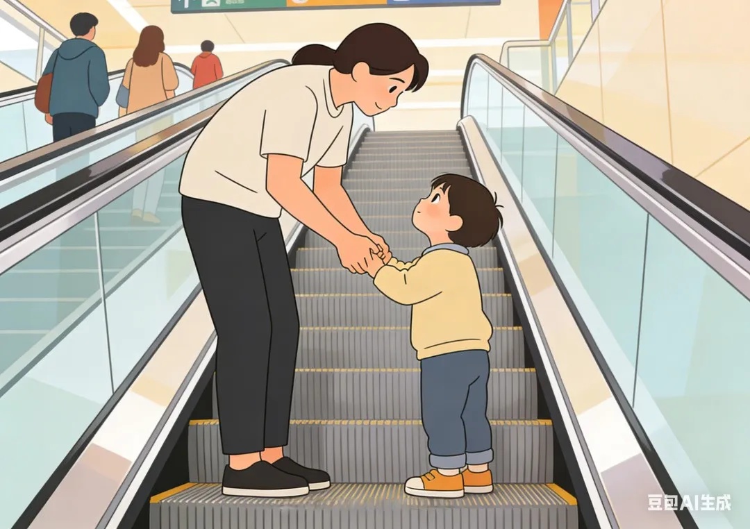 乘坐自动扶梯时,务必让孩子站在梯级黄线内,站稳扶好,不在扶梯进出口处停留、逆行、追逐打闹,不随意触碰应急按钮。穿洞洞鞋的儿童需格外留意,避免鞋体被扶梯边缘卷入;推婴儿车的家长请全程走无障碍电梯,切勿推婴儿车搭乘自动扶梯。