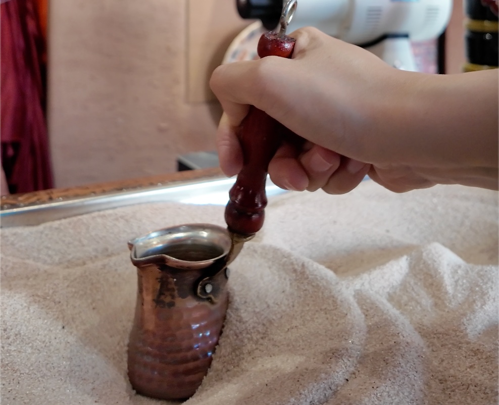 在“土屋”咖啡馆,体验用铜壶在200度的热沙上慢慢推煮咖啡。