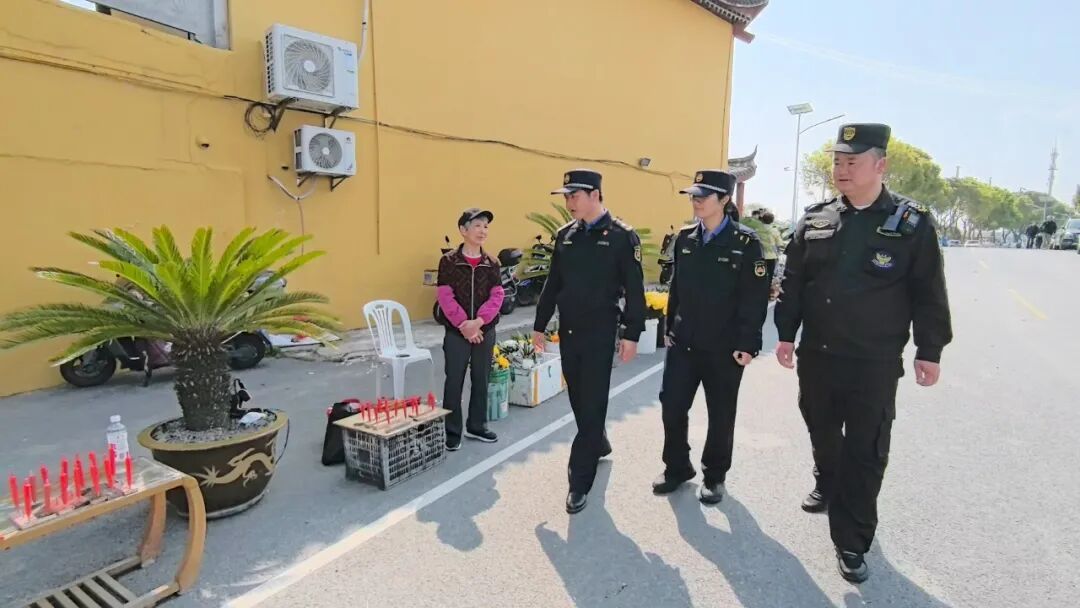 考虑到市民祭扫需求,亭林镇综合行政执法队坚持“疏堵结合、便民利民”的理念,在松隐山庄南门入口处合理设置了临时经营疏导点,统一划定经营区域、明确经营时段,并安排专人现场管理引导,既让摊贩有了固定的经营场所,也方便前来祭扫的市民就近买到鲜花和蔬果,真正实现了市容有序、市民便利的多方共赢。