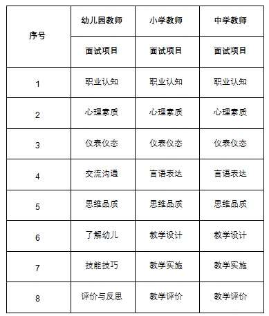 各学段教师资格考试面试项目具体如下(中职教师面试项目同中学教师):