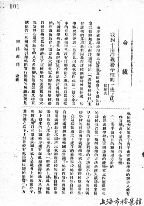 1922年,侯绍裘于《南洋周刊》发表《我对于南洋义务学校的一些意见》文章(上海市档案馆馆藏)