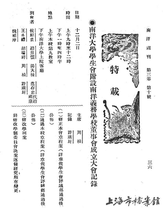 《南洋周刊》特载南洋义务学校董事会成立大会记录,到会者第一位为侯绍裘(上海市档案馆馆藏)
