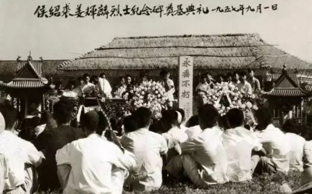 1957年9月,为纪念侯绍裘烈士殉难30周年,松江县在松汇路选址新建侯绍裘、姜辉麟烈士纪念碑,图为奠基典礼现场。(图片系本文作者提供)