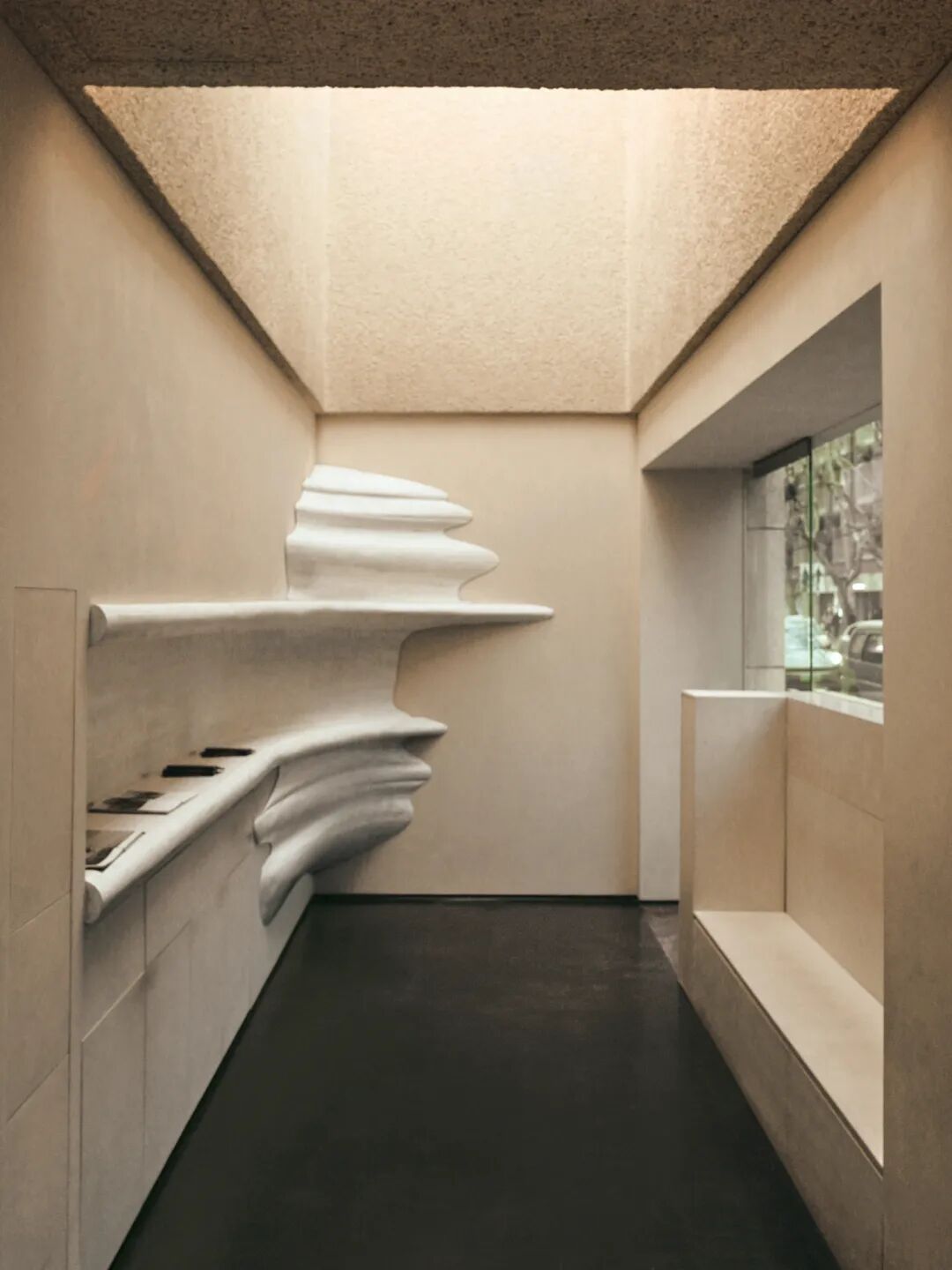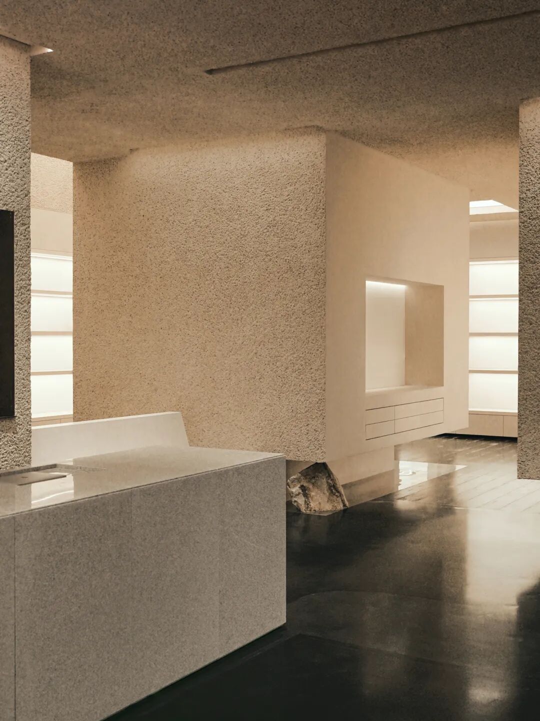 在新空间中,保留并修缮了陪伴门店五年的山体。该结构由樟子松实木层层拼接而成,师傅手工⼀点点用砂纸打磨,经几十道工序反复完成,上漆、阴干、再打磨、再上漆,且环境友好。