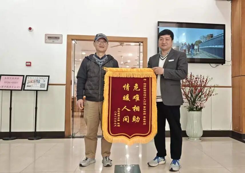 “危难相助 情暖人间”——近日,这面锦旗被送至杨浦图书馆少儿分馆,承载着一位九旬老人家属的深深谢意。