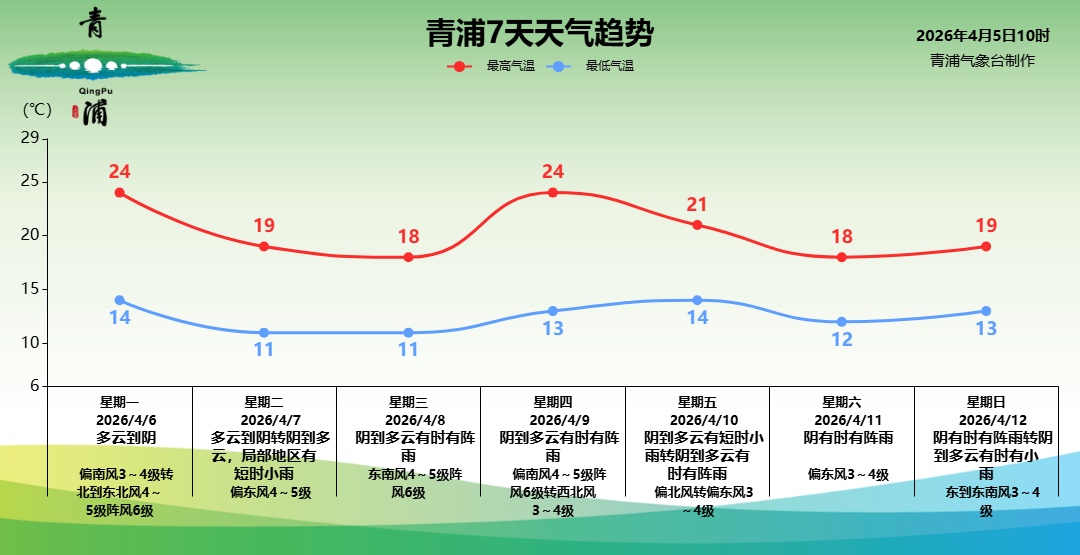 青浦区今明天以多云为主,体感适宜,建议抓紧洗晒。假期过后,随着雨带的移动本区又将迎来一段多降水天气,气温起伏不大,整体在11-24℃。春季天气多变,请大家及时关注临近预报信息,做好生活及出行安排。