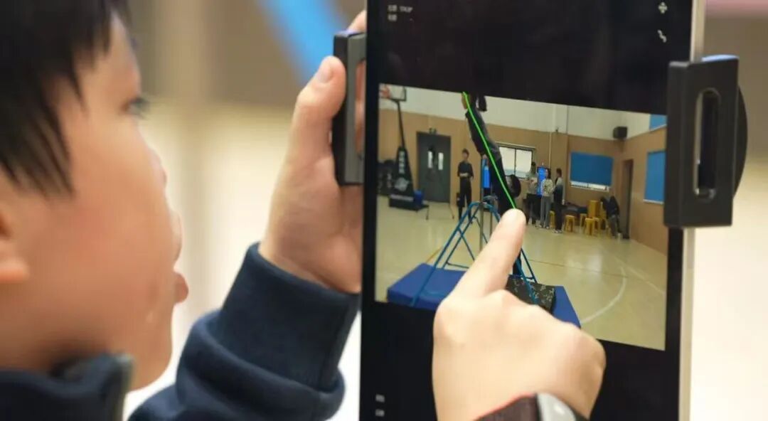 特别的是,课堂里引入了AI动作分析工具,各小组的设备前都架着一台平板电脑,“这一轮,我来负责拍摄,系统能记录下同伴的动作组合,并进行打分哦!”学生自行分工。