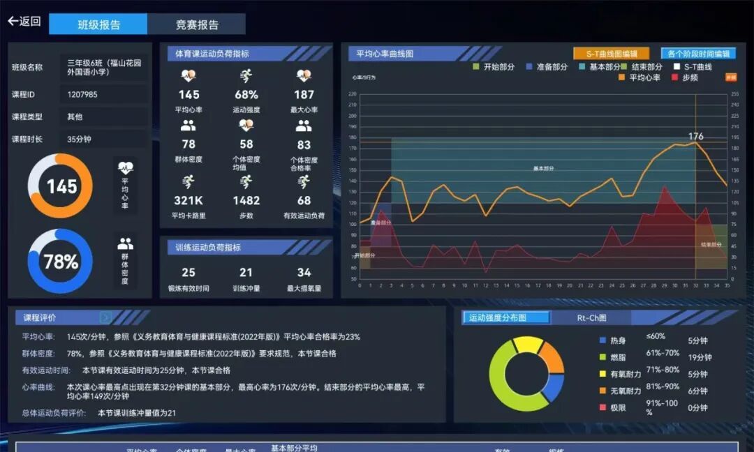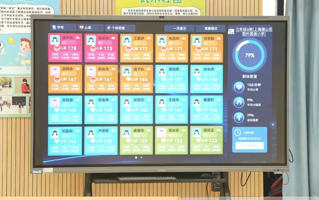 此外,小编还注意到,体育馆内安装了智慧大屏,学生戴上手环,做各类运动时,大屏上会显示每个人的实时心率,让教师更直观地了解学生的运动情况。
