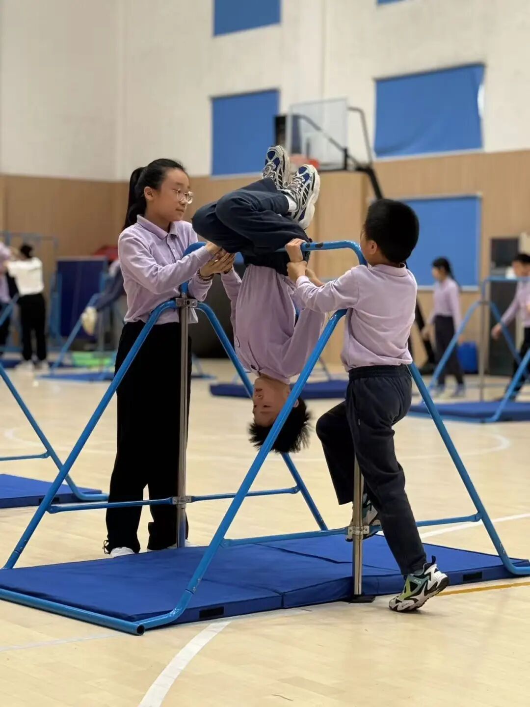 小编了解到,在福山花园外国语小学,所有体育教师都能上单杠课,体育教研组长顾剑君介绍,资料显示,中国青少年的上肢与核心力量比较薄弱,因此,学校决定开设低单杠课程,帮助学生循序渐进提升上肢力量、核心稳定性与身体协调能力。