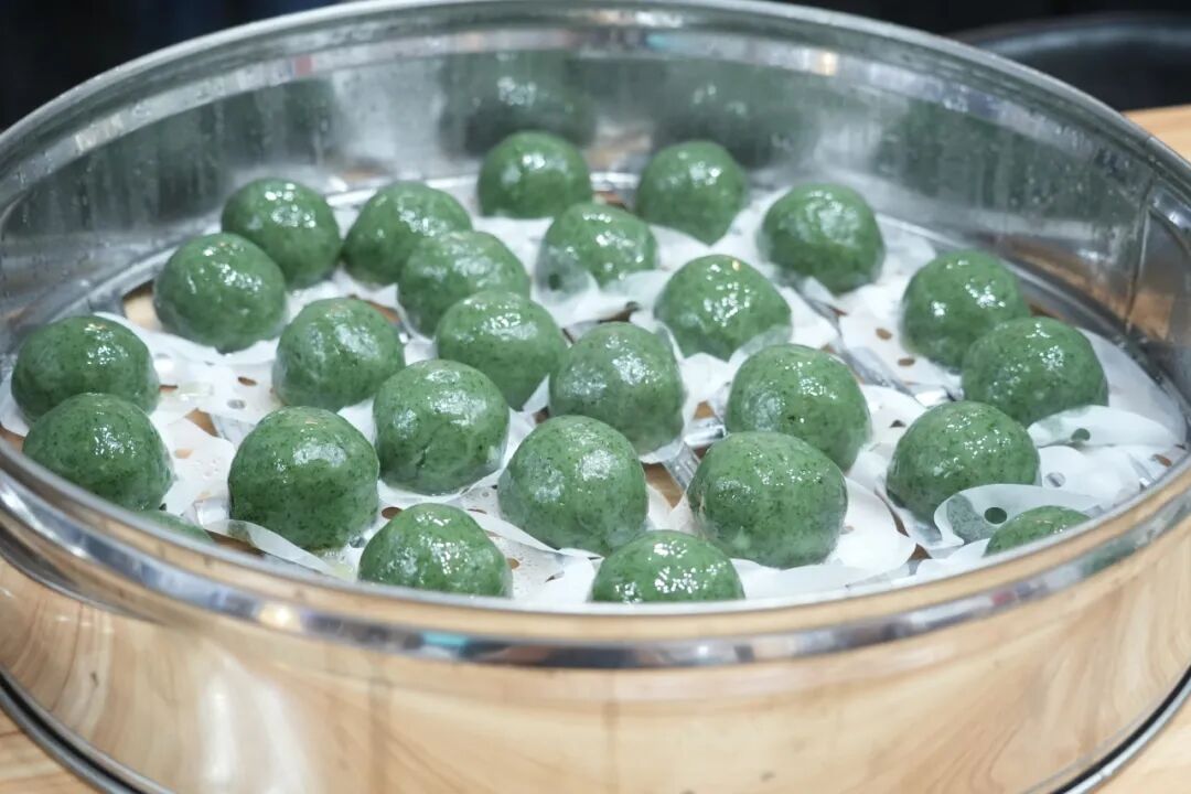 随后进入手作青团环节,职工们戴上手套,揉面、分剂、包馅、收口、搓圆……大家分工协作,互相交流,欢声笑语不断。碧绿的艾草面团在手中翻飞,咸蛋黄肉松与黑芝麻馅料香气四溢,不一会儿,一个个圆润饱满、色泽翠绿的青团整齐摆满托盘。