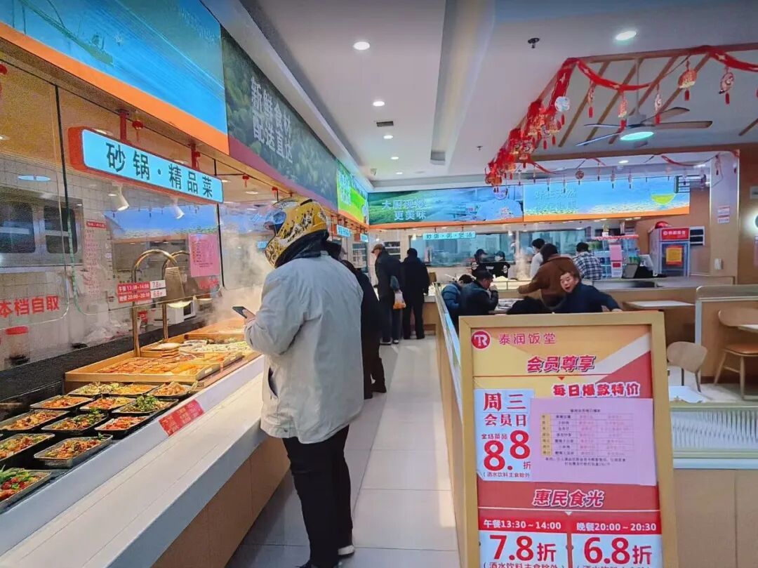 中午十一点,泰润食堂的档口前开始排起小队。不同于街边的独立餐馆,这里更像一个社区里的“大食堂”。红烧肉油亮、清炒时蔬碧绿、蒸鱼热气腾腾……三四十个菜品一字排开,从本帮浓油赤酱到清淡小炒,选择很多。
