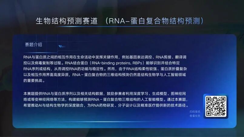 生物结构预测赛道聚焦 RNA–蛋白复合物三维结构预测这一关键前沿问题。针对RNA构象高度柔性、相互作用界面复杂且异质性强等核心挑战,鼓励选手发展融合深度学习、生成式建模与等变神经网络的统一建模框架,实现对分子序列、空间构型与相互作用关系的协同刻画。参赛者需完成从数据解析、模型设计到结构生成与精度优化的全流程科研闭环,探索AI与结构生物学在复杂生物体系中的深度融合路径。相关研究有望为RNA药物开发、抗病毒机制解析及精准医疗提供新的方法学基础与技术支撑。