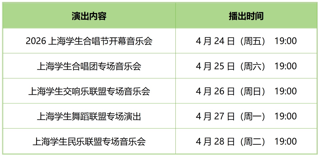 4月24日起,五大学生专场演出将通过东方网、看看新闻、上海教育电视台视频号、上海文教结合视频号、上海艺教视频号等平台陆续播出,部分展演作品将通过上海教育微信视频号展播。让我们一起期待,共赴一场春日美育之旅。