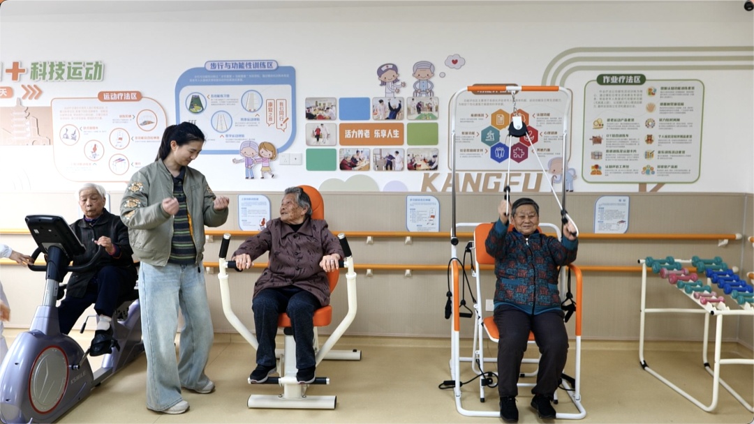 康复室内配备了认知障碍训练、上下肢康复训练等专业器材,由经过专业培训的院内护理人员指导老人开展系统训练,旨在通过持续、高频的日常干预,帮助老人改善肢体功能、增强肌力,从而真正提升生活自理能力。