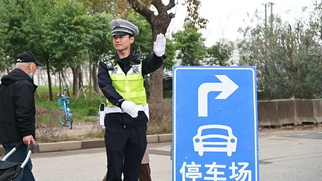 与此同时,临港新城福寿园海港陵园也迎来祭扫车流高峰。书院派出所民警提前驻守杞青路两港大道口,与交警密切配合,有序引导车辆入园。陵园入口处人流密集,民警在岗值守,配合墓园工作人员开展预约信息核验,保障祭扫活动安全规范、平稳有序。与长桥山庄相比,海港陵园停车场空间较大、车位更为充裕,但出入口较多。为避免车流对冲,民警在停车场西入口、正门口及园区内部全程开展分流疏导,细致指挥车辆停放、规划驶离路线,确保停车场及周边道路通行顺畅。
