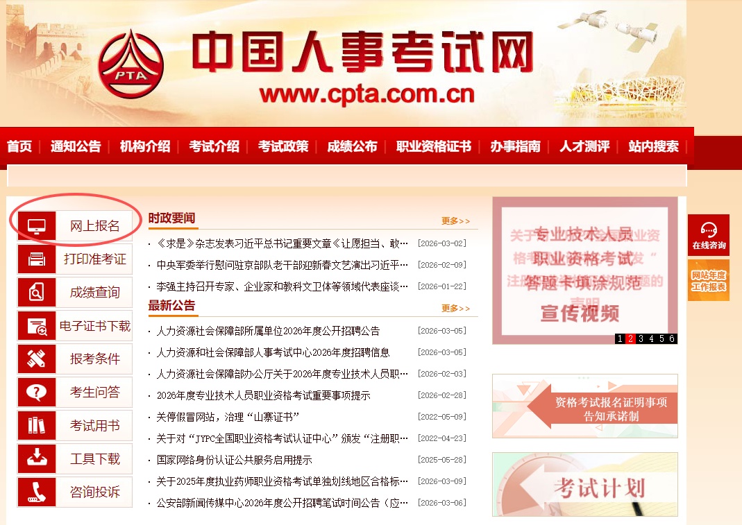 中国人事考试网(www.cpta.com.cn)“网上报名”栏目