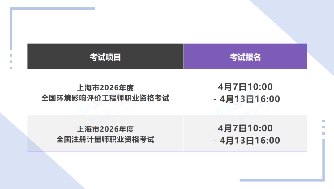 3.本市2026年度环境影响评价工程师、全国注册计量师资格考试不收取报名考试费,考生须于2026年4月17日10:00-4月18日16:00进行网上核对确认。核对确认时,应再次进入报名系统,点击“查看当前报考状态”,当前报考状态栏中“报名完成”按钮显示为蓝色方可视为报名成功,同时确认本人符合报考条件、报考信息无误(特别注意报考级别、专业和科目务必准确),报名成功的考生应下载报名表备用。