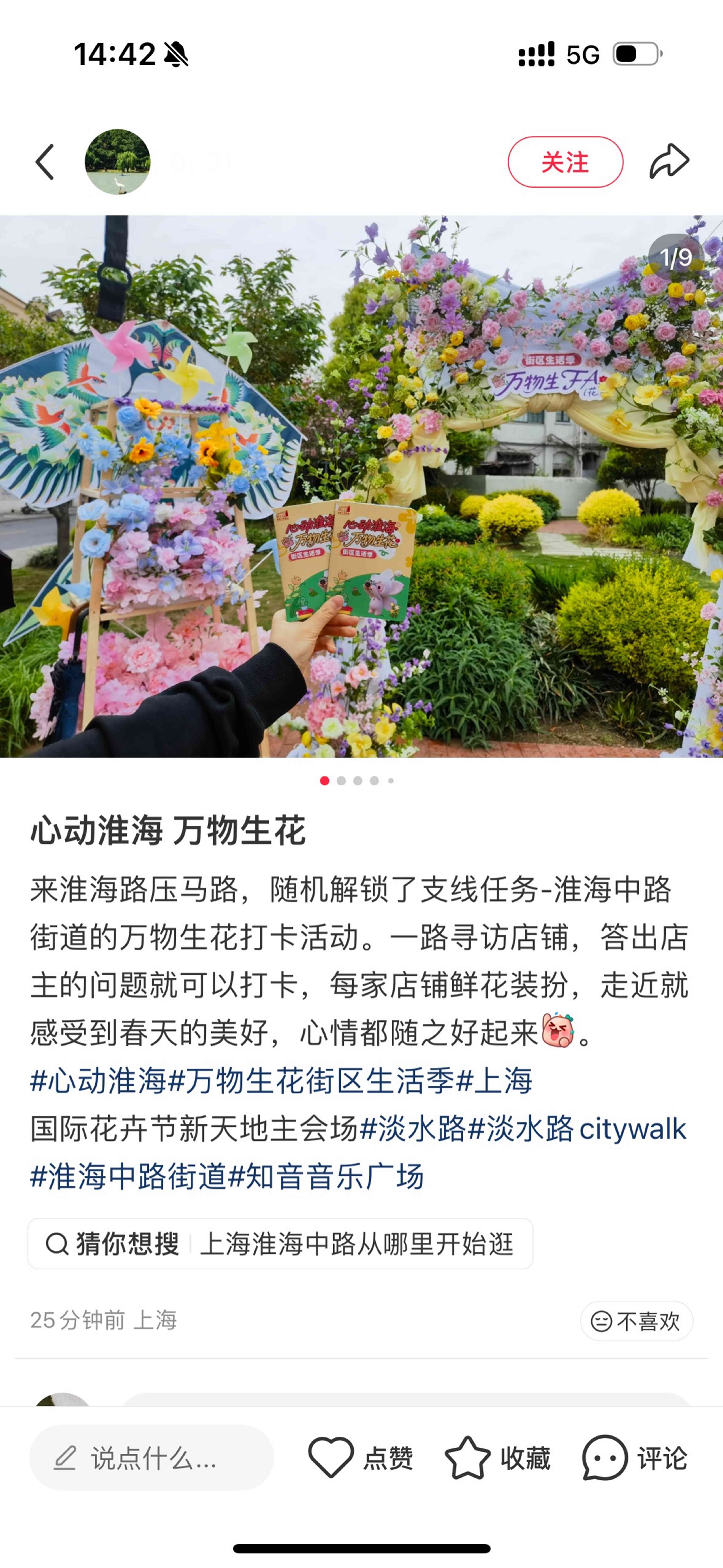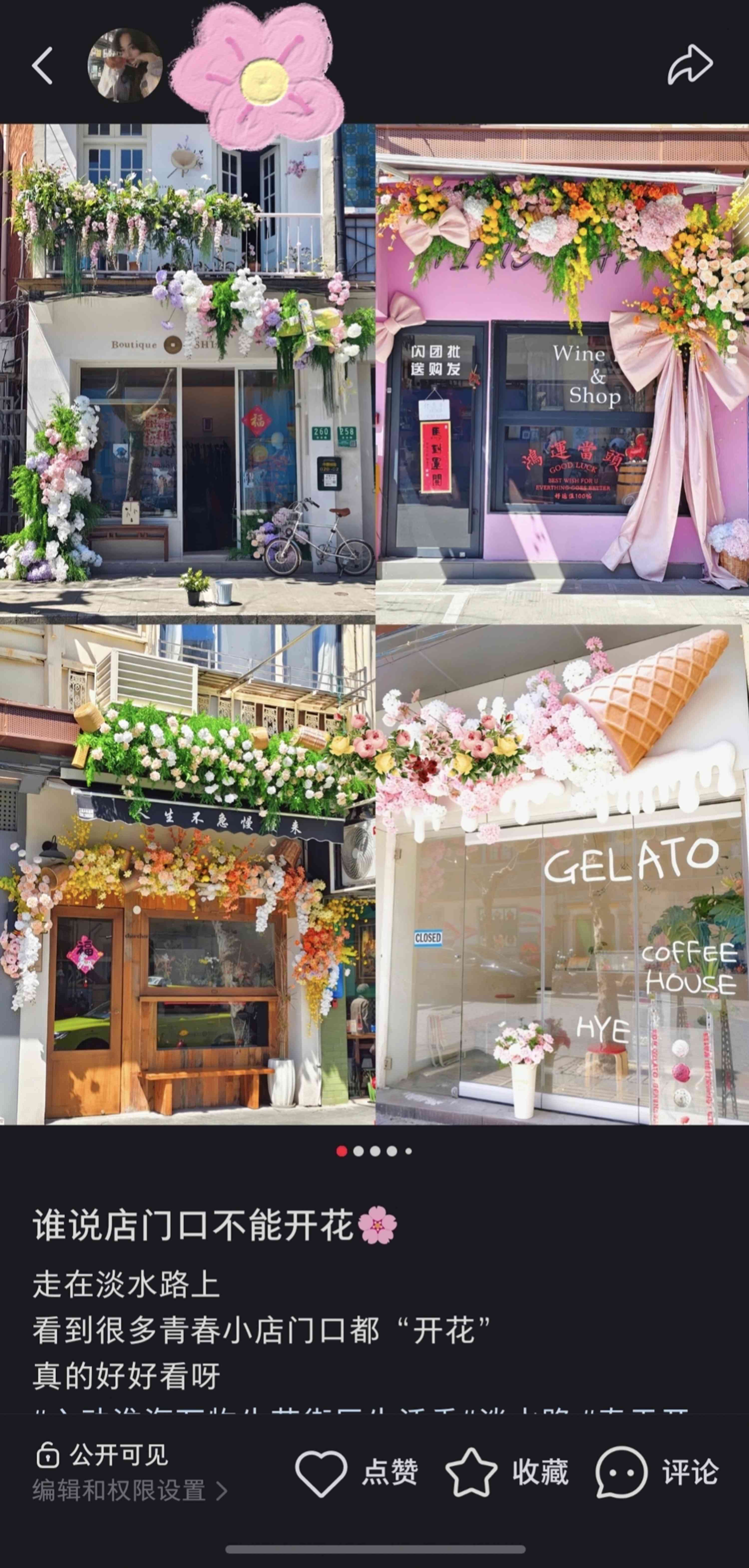 “刷到预告特意来的,拍了好多有氛围感的照片,准备发小红书当我的春日首更。”完成所有打卡任务后,很多年轻人自发分享小红书探店笔记,“淡水路Flower Walk”一下子成为新晋潮流,让这场探店之旅更具仪式感。一时间,氛围感十足的笔记刷屏社交平台,淡水路的春日景致、特色小店的独特魅力被广泛传播,成为这场Flower Walk的点睛之笔,也让这些藏身小马路的青春小店成功出圈。