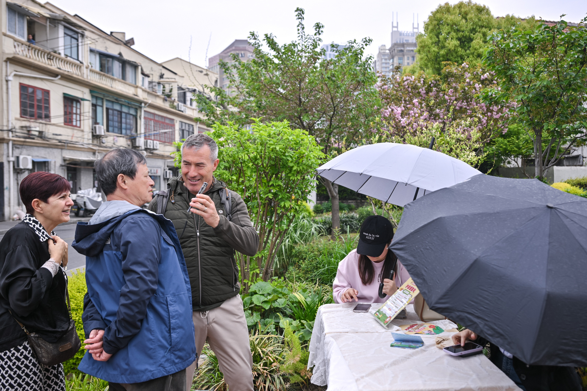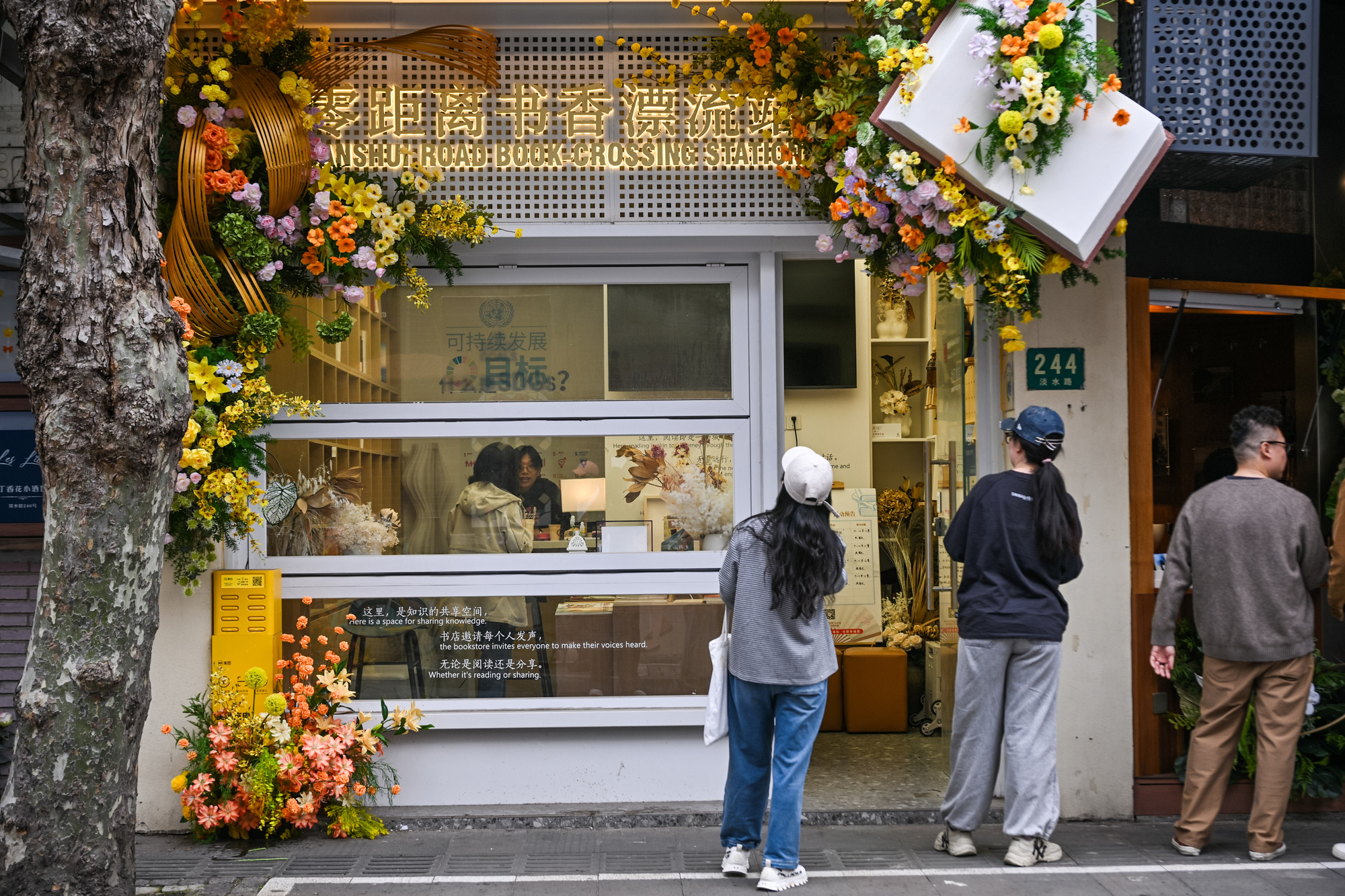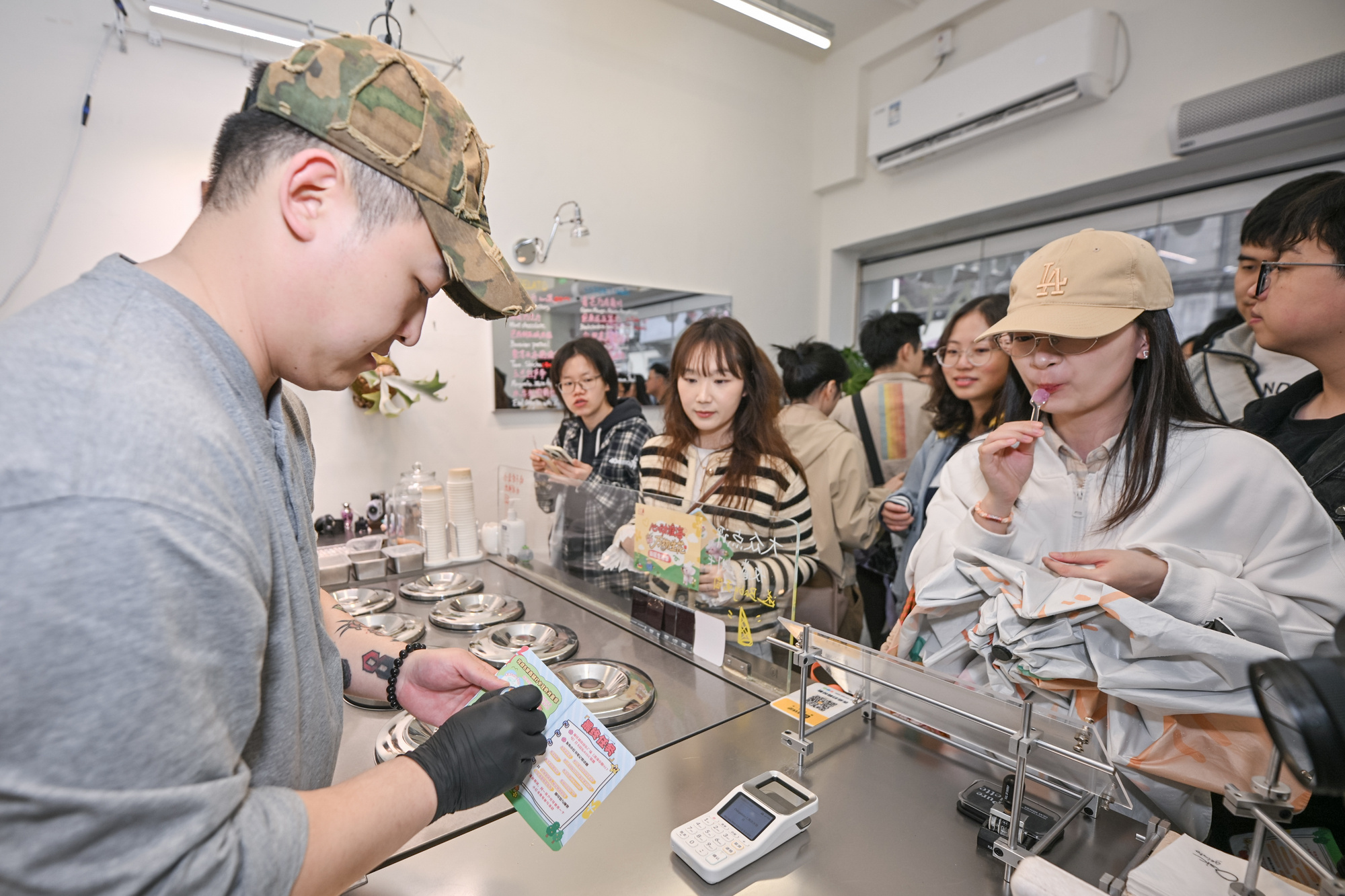 大施裁缝铺里,游客触摸肌理、辨识工艺,在互动中体悟传统匠心;Osic Gelato前,花香与甜香交融,冰淇淋试吃猜味的乐趣藏着春日治愈;零距离书香漂流站内,大家穿梭书架寻找花主题书籍,在文字间邂逅春日诗意……打卡正酣时,一场春雨悄然降临,淅淅沥沥浸润街巷,却未浇灭大家的探店热忱。“下雨反而更有味道,雨珠落在花瓣上,拍照超出片。”正在Osic Gelato门口打卡的年轻人说道,手里的护照已经盖了大半,即便下雨也不想错过任何一个点位。