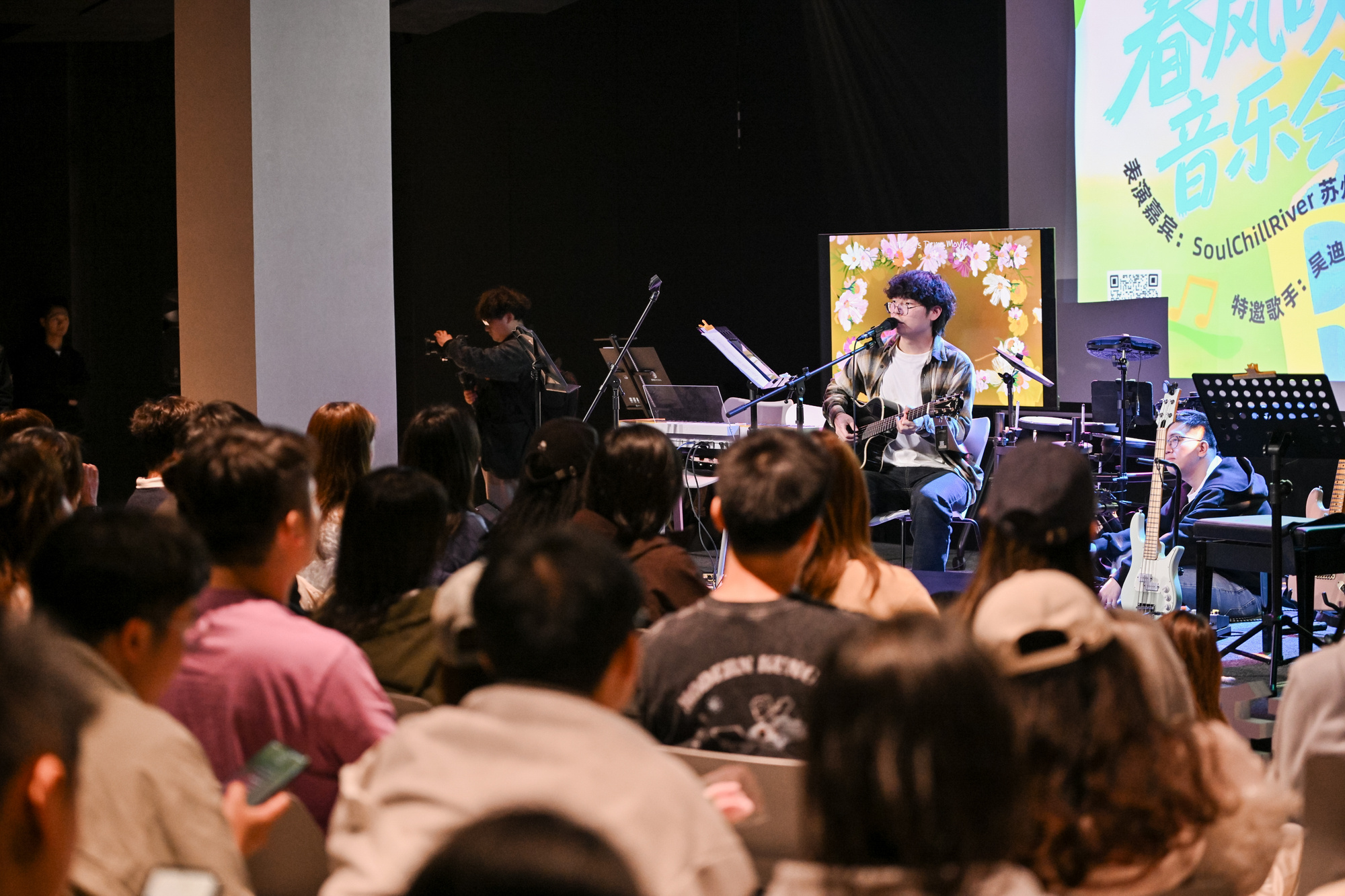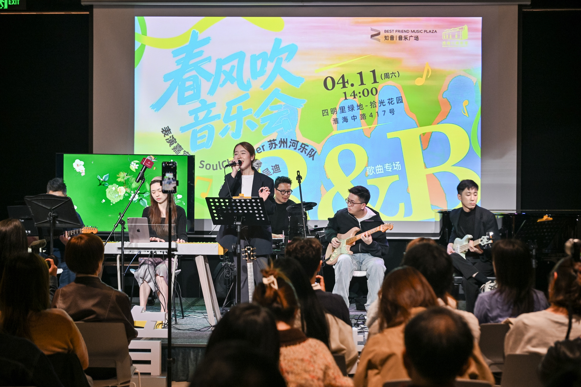 打卡的尾声,知音·音乐广场被挤得满满当当,成为整场活动最具氛围感的聚集地。苏州河乐队如约登场,当春天的旋律响起,瞬间点燃全场热情,音乐厅内外座无虚席,连舞台下面都坐满了人。每个人都沉浸式沉浸在这场春日音乐盛宴中,跟着节奏挥手、合唱,卸下所有疲惫,将探店的快乐与春日的浪漫推向顶峰,也为万物生花之旅画上了浪漫的句号。