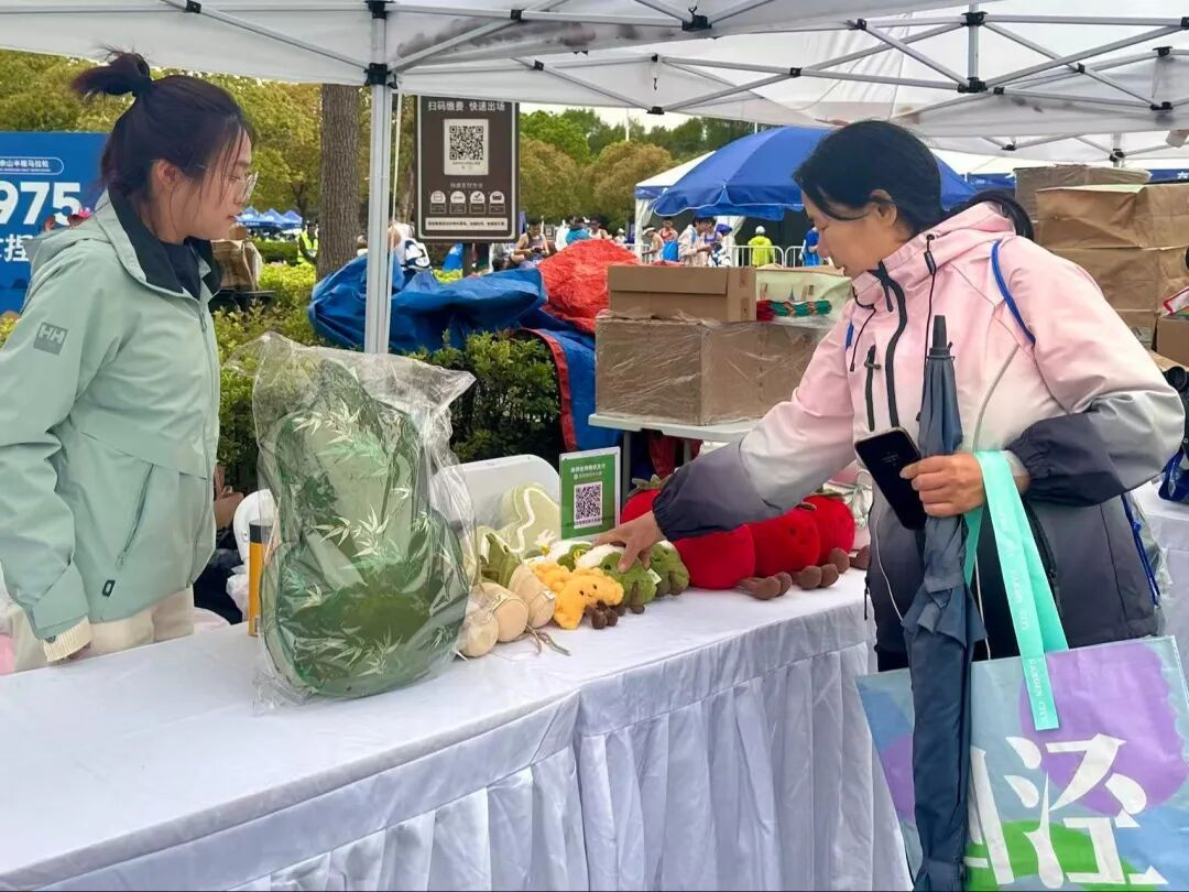 上午九时三十分,随着选手陆续冲线完赛,现场的市集也渐渐热闹起来。佘山文创的展位前,结合本地元素设计的玩偶、抱枕等各类毛绒文创产品整齐陈列,吸引了不少完赛选手与亲友团的光顾。“我是陪爱人来参赛的,凌晨4点就从浦东赶过来了。”来自浦东的张女士拿着“佘山兰笋”造型的挂饰,爱不释手。她坦言,以往观赛等待的时间,既紧张又枯燥,这次有市集可以逛一逛,刚好打发时间,等候的过程也变得轻松惬意。