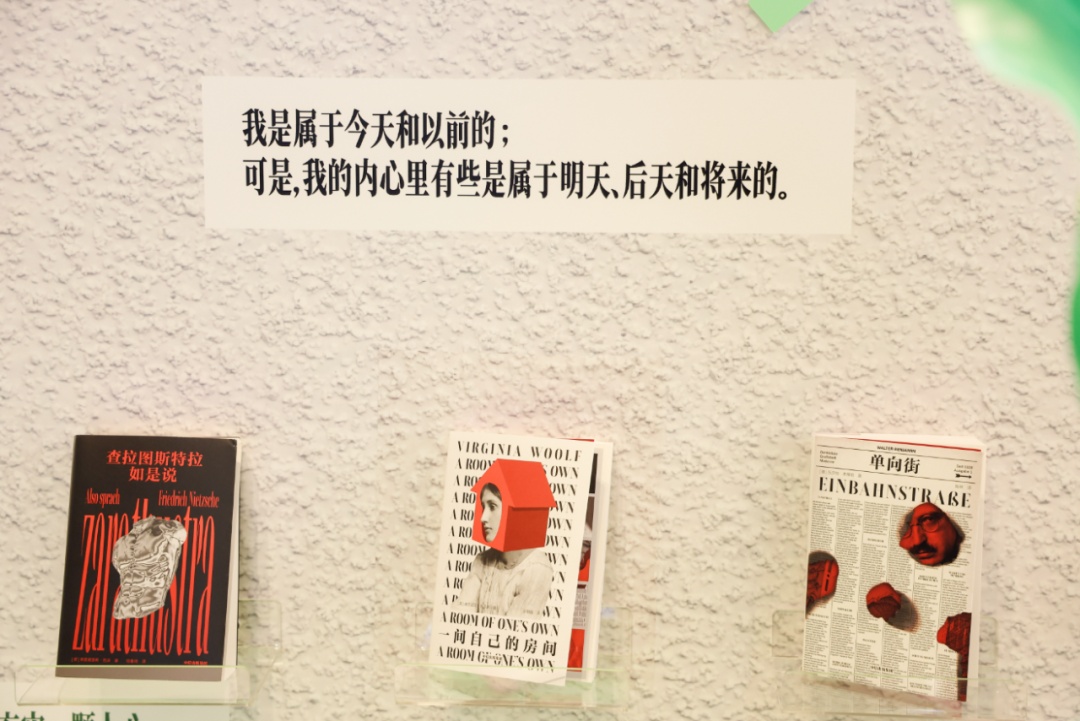 现场以中信出版旗下“生火”系列文库本为核心,结合趣味互动装置,打造了一座“互动叙事美术馆”,展出《一间自己的房间》([英] 伍尔夫)、《查拉图斯特拉如是说》([德] 尼采)、《沉思录》([古罗马]马可·奥勒留)等世界级著作,同时,将国内知名作家邱兵、张二冬、尹维安、鲁引弓等的出版作品以“可翻动的书本”等细节巧思进行沉浸式场景构建,打造“流动的穿梭空间”。