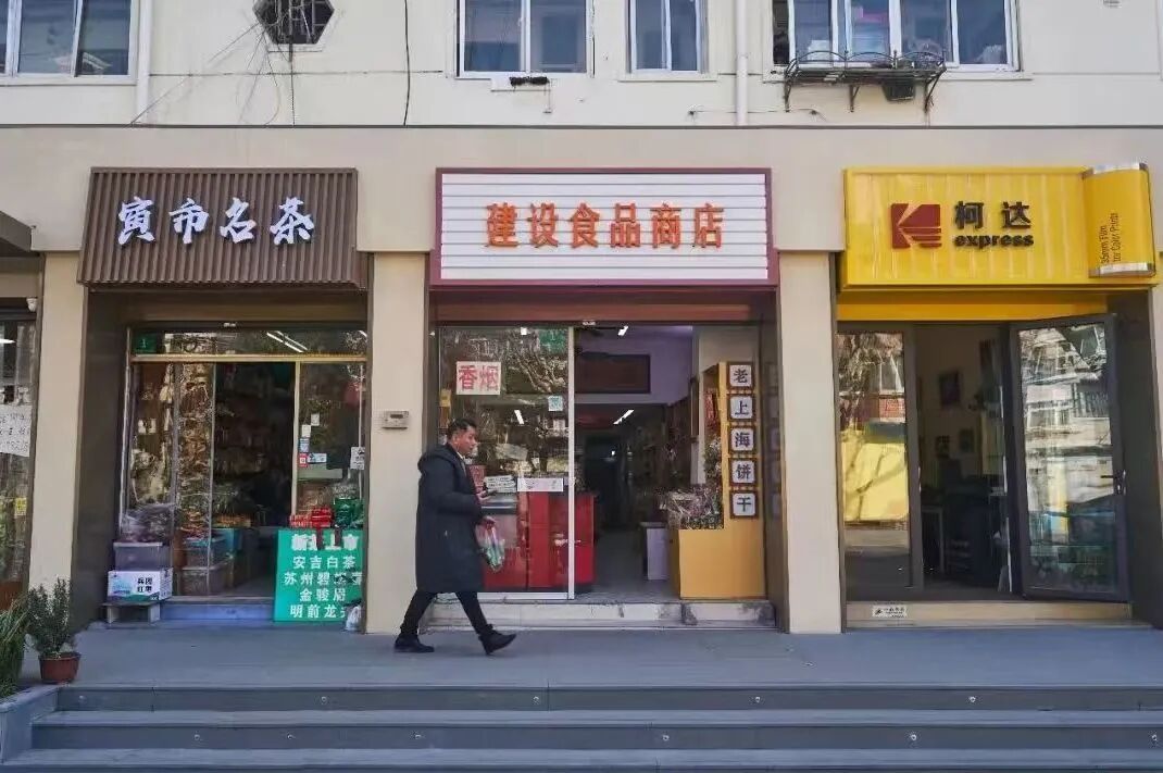 对于扎根社区数十年的老铺,街道没有选择“改头换面”,而是“点亮记忆”。建设食品商店保留了玻璃柜台、饼干货架的经典布局,万年青饼干、陈皮糖的陈列唤起“小辰光额米道”。小克勒冷饮批发店的店主是申花球迷,街道支持他将热爱融入店铺——蓝白配色、球衣照片、业余奖杯,让小店成为社区体育文化的聚集地。