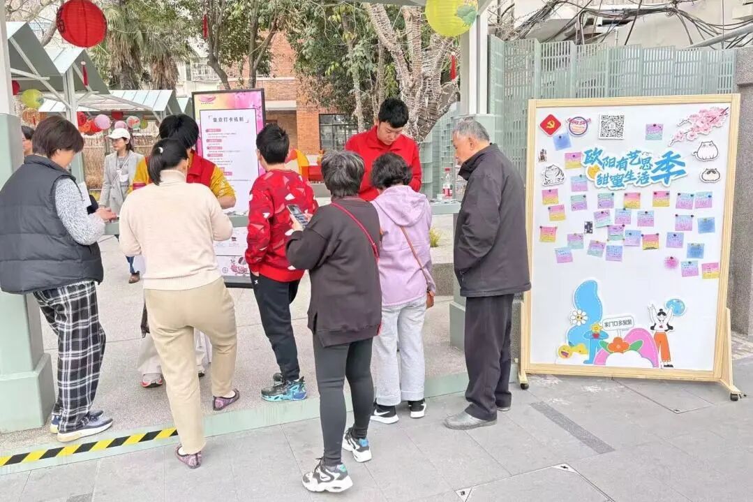 而在祥德路76弄1号,手持樱花季打卡纸的居民们拍照互动,收获限定冰箱贴。在祥德路144弄,大家写下对街区的意见建议,免费打印一张美照,不少年轻人循着指引穿梭在街区,只为集齐这份专属浪漫。
