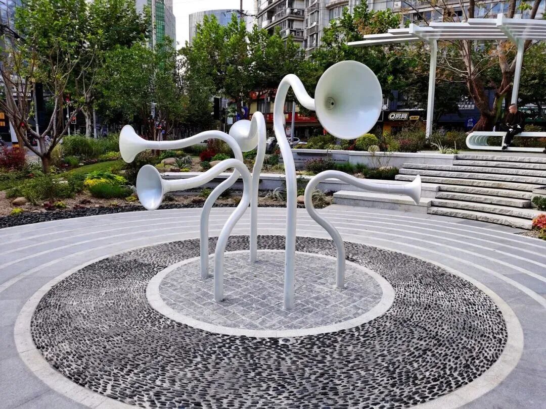 静安与普陀区交界处的胶州路、安远路口,有一座口袋公园,名为“聆听自然的音花园”。口袋花园广场正中设置了一座多维度喇叭装置,贴耳倾听,果真能听到鸟语蛙鸣、水声潺潺。这是大自然的天籁之声,也是人们对幸福美好生活的渴望。