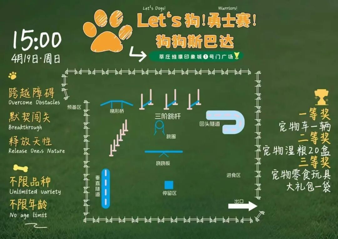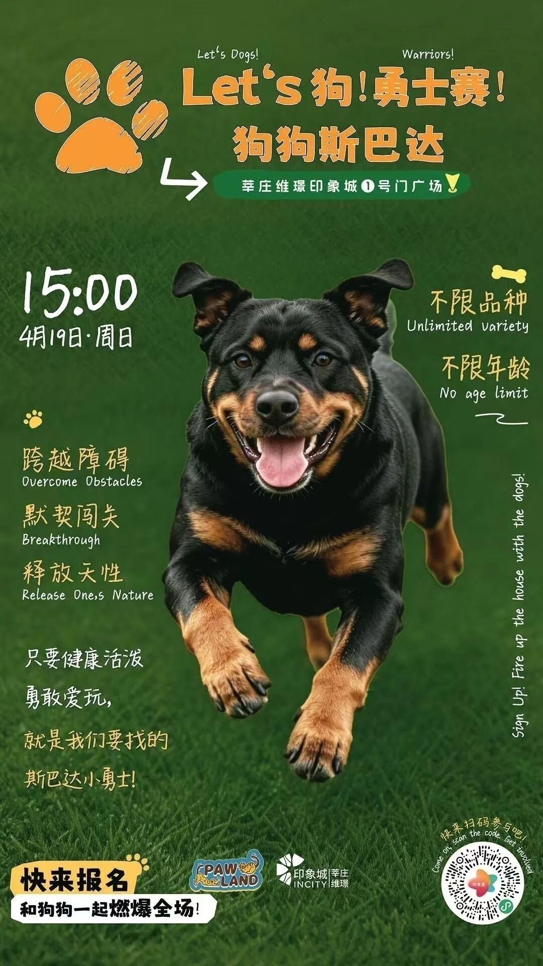 次日(4月19日)15:00,“Let's狗!勇士赛!狗狗斯巴达”将在莘庄维璟印象城1号门广场开赛。这场不限品种、不限年龄的宠物挑战赛,以“跨越障碍、默契闯关”为核心,设置梯形桥、三阶跳杆、回头隧道等趣味关卡,鼓励狗狗释放天性,与主人共同完成挑战。