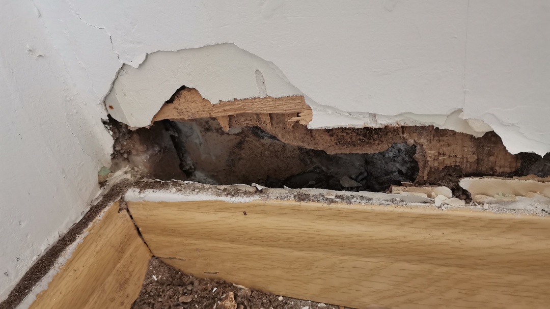 如果发现家中木门、衣柜、地板、踢脚线等木质构件,用手轻轻敲击有“空洞”声,或是轻轻一碰就掉木屑,说明木质结构已经被白蚁严重蛀空,存在坍塌风险,需立即做好应急防护,同时联系专业人员。