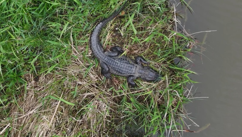 在另一处水域边,通过航拍发现,一只扬子鳄静静卧在河边一处水洼中,表皮黑亮,通体可见,正享受着温暖日光。