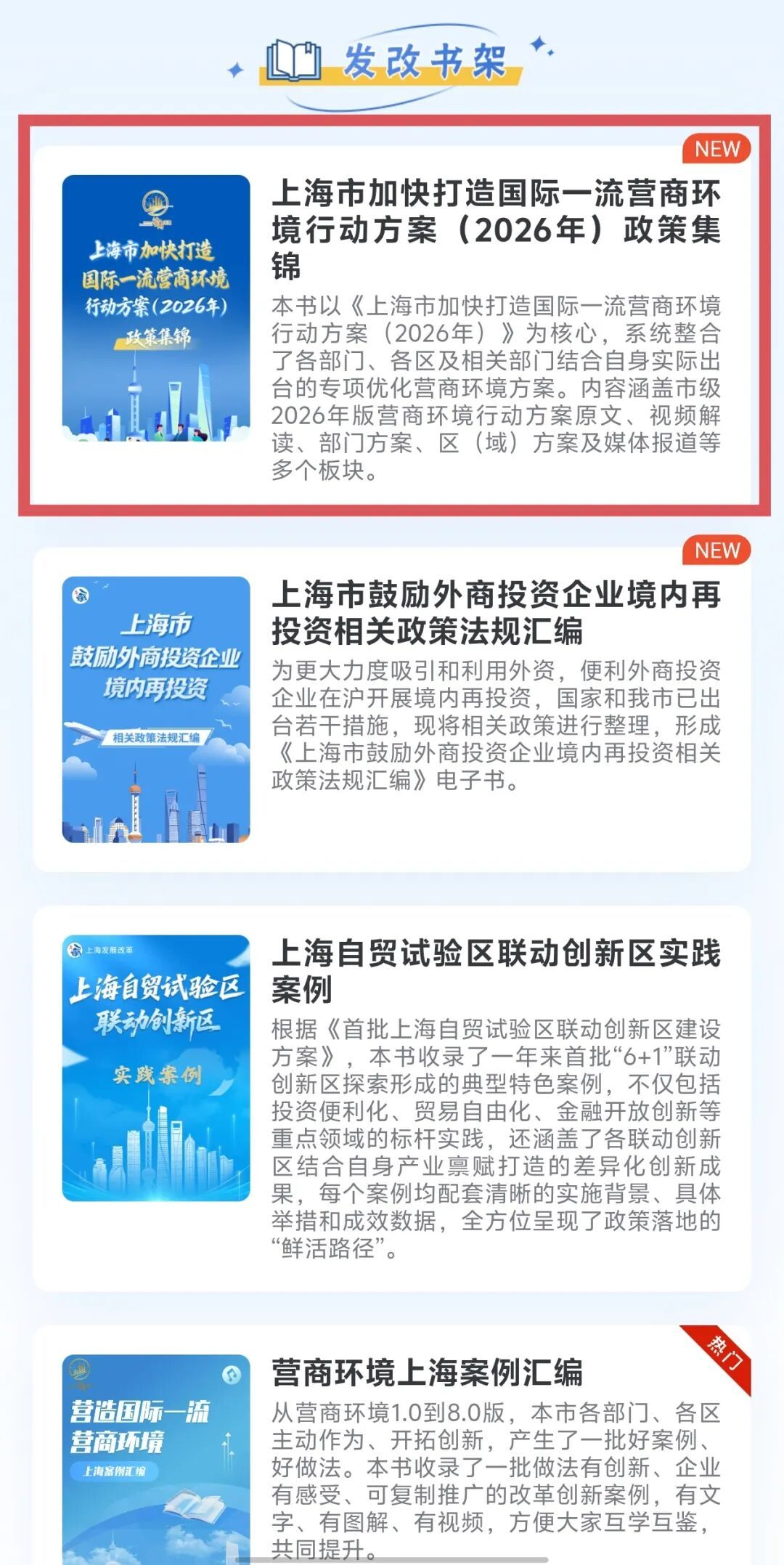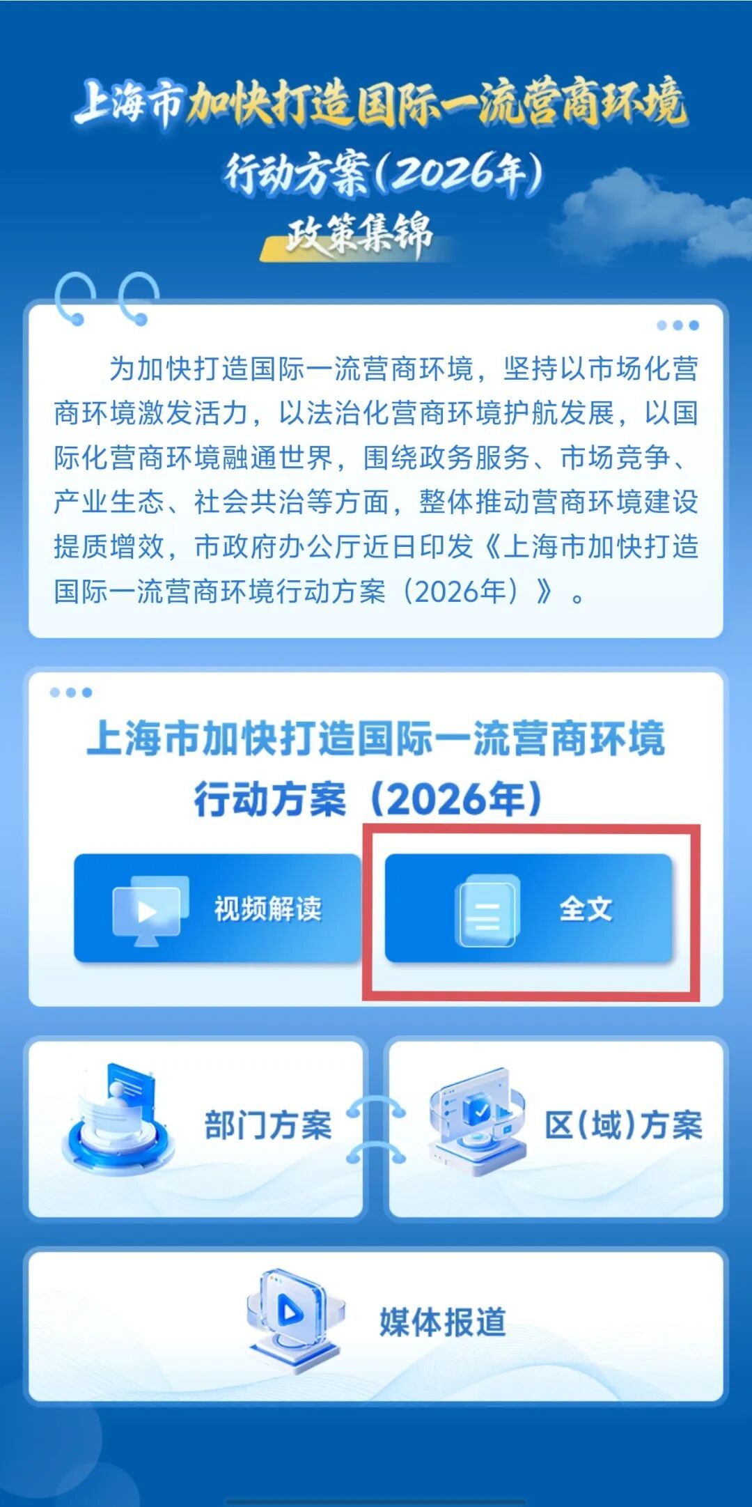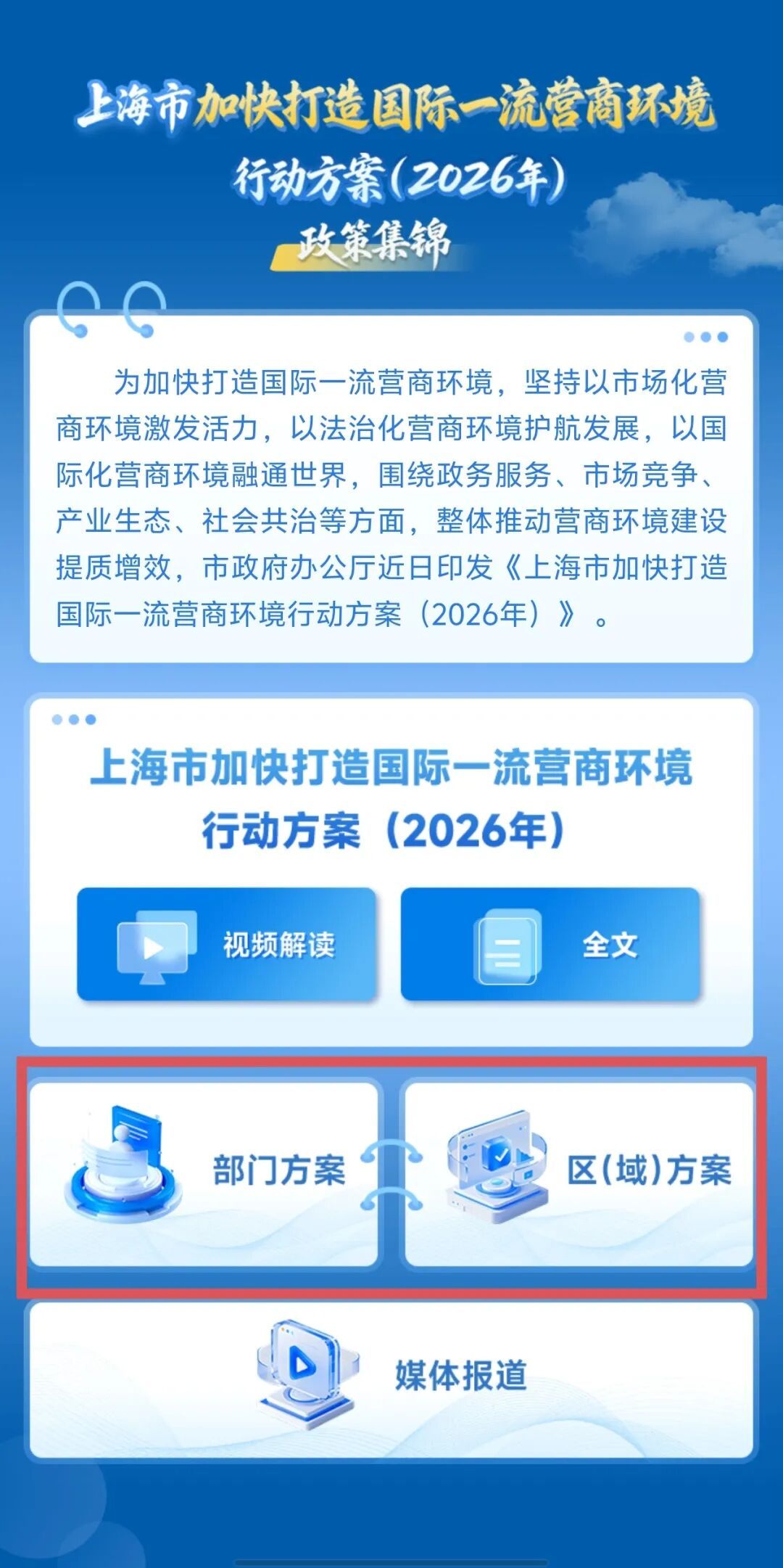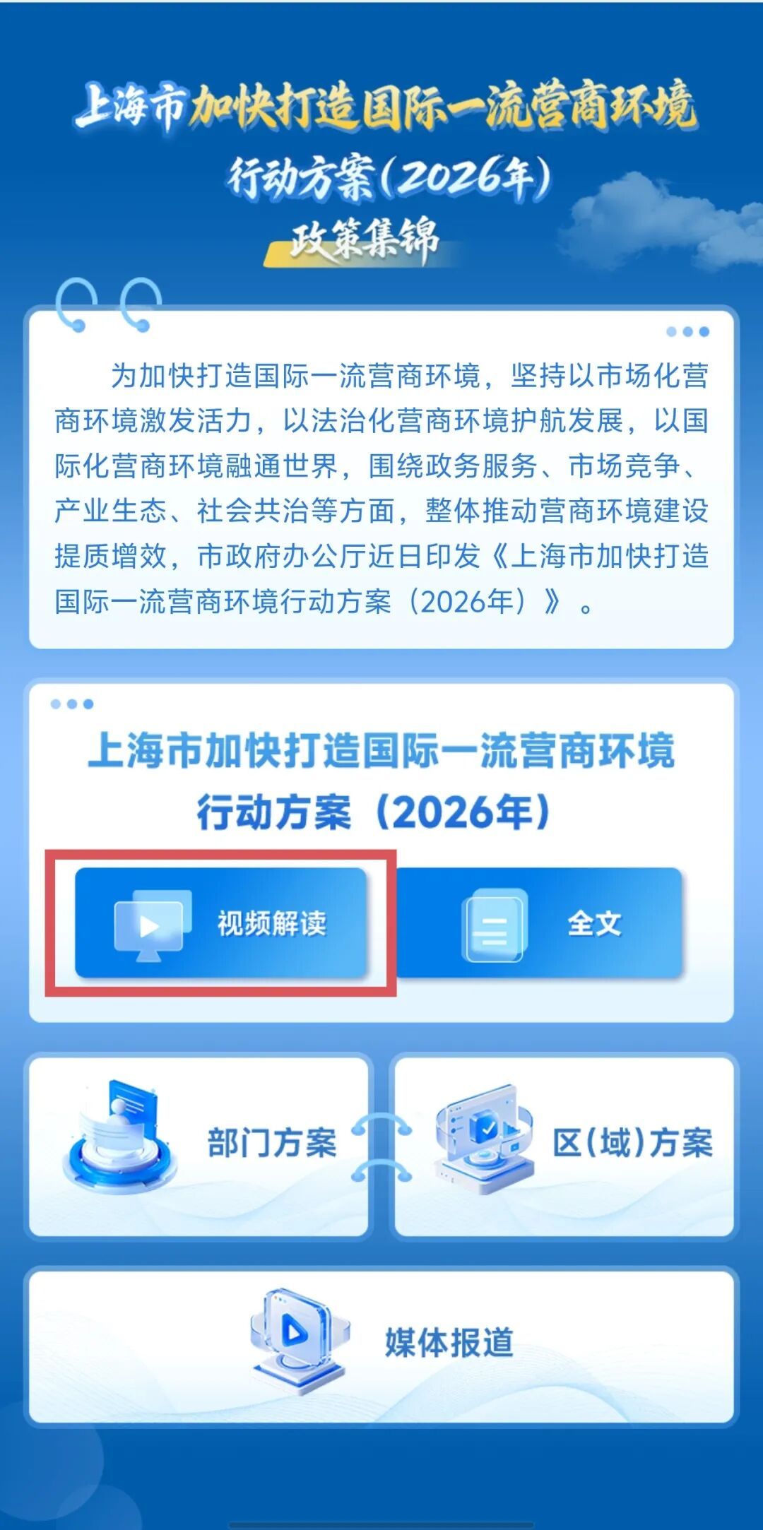 新年的第一个工作日,2026年全市优化营商环境大会召开,发布《上海市加快打造国际一流营商环境行动方案(2026年)》,围绕政务服务、市场竞争、产业生态、社会共治四大环境,推出了一系列务实举措,各部门、各区积极响应落实,制定出台专项优化营商环境方案。为方便各类经营主体和社会各界系统了解、快速查阅相关内容,我们制作了《上海市加快打造国际一流营商环境行动方案(2026年)》政策集锦电子书,今日正式上线! 这本电子书包括市级2026年版营商环境行动方案原文、视频解读、部门方案、区(域)方案及媒体报道等多个板块,快来了解一下吧~