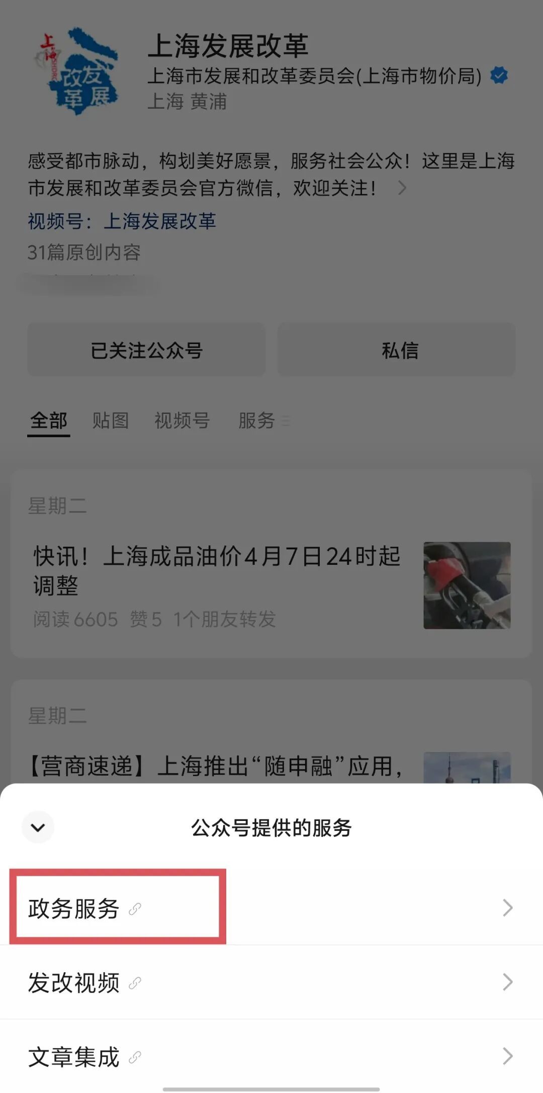 2、关注“上海发展改革”微信公众号,点击微信按钮“政务服务”,在“发改电子书”栏目查看相关内容