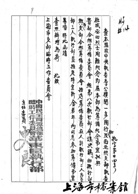 中国民主同盟总部临时工作委员会华东区执行部关于筹备李公朴、闻一多等四位殉难烈士纪念事宜的通知(上海市档案馆藏)