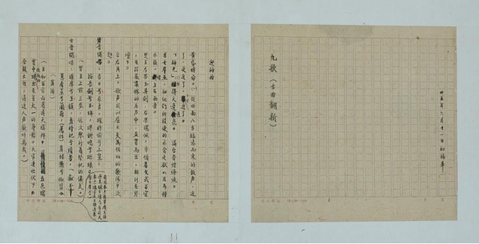 很快,闻一多在工作之余奋笔疾书,以《九歌(古曲翻新)》为题,将《九歌》改编为十场歌舞剧。创作完成后,他郑重地在稿纸首页写下“卅五年六月十一日初稿毕”,又作了几十处修改,还特意抄写了几份。
