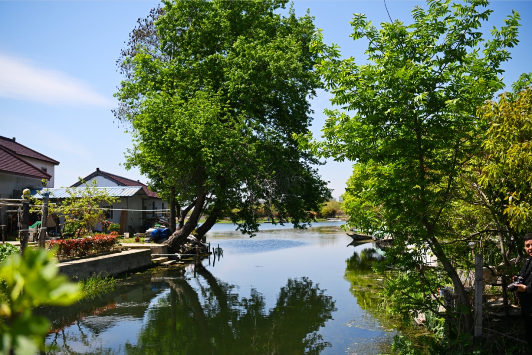 暮春的青浦金泽,湖荡泛着碎金般的光。芦苇丛间白鹭掠过,远树倒映水中,静谧得仿佛能听见时间流淌的声音。这里是西岑村的一个自然村落——山深村。6个小岛、3个村落组团,层层叠叠的水与田,构成了一个漂浮在蓝色珠链上的世外桃源。