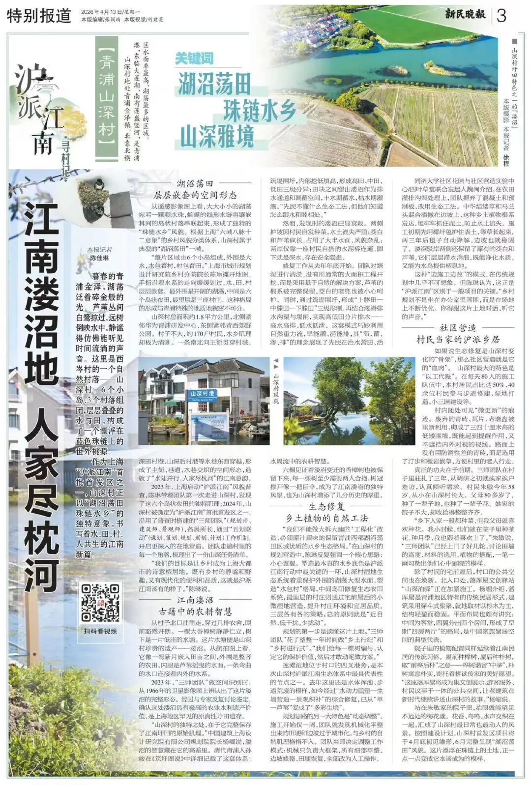 站在朱敏家的院子里,抬眼就能望见不远处的梅花漾。花香、鸟鸣、水声交织在一起,汇成了山深村最日常也最动人的风景。按照建设计划,山深村首发区项目将于4月底初见雏形,6月完整呈现“湖沼荡田”风貌。这片漂浮在珠链上的土地,正一点一点变成它本该成为的模样。