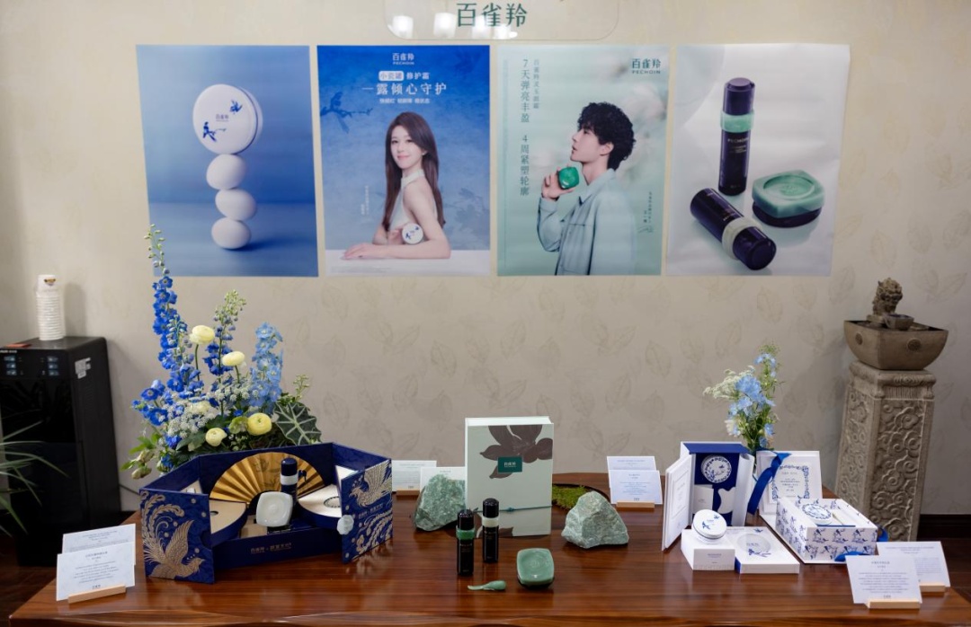 百雀羚始于1931年,深耕草本与科技融合,携手非遗大师将青花瓷、玉雕等工艺融入产品,本次展出东方礼灵玉系列、非遗青花瓷礼盒等,兼具美学与收藏价值。