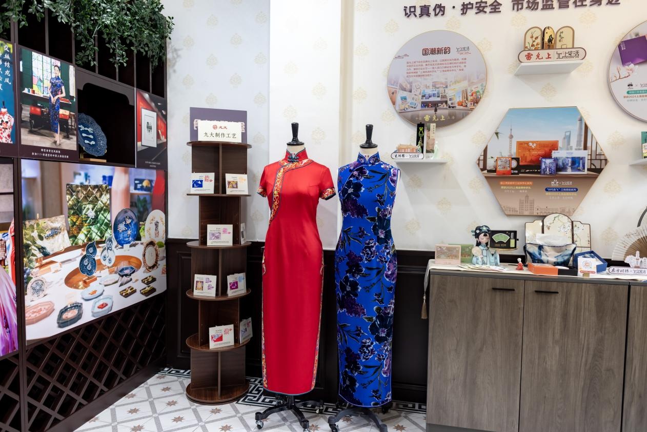 龙凤旗袍(开开集团)创始于1936年,以九大手工工艺打造海派旗袍。展台之上,柿柿如意盘扣、蕙质兰心团扇、花香蝶舞压襟等非遗手作整齐陈列,更有非遗传承人坐镇,现场展示盘扣制作的传统技艺。