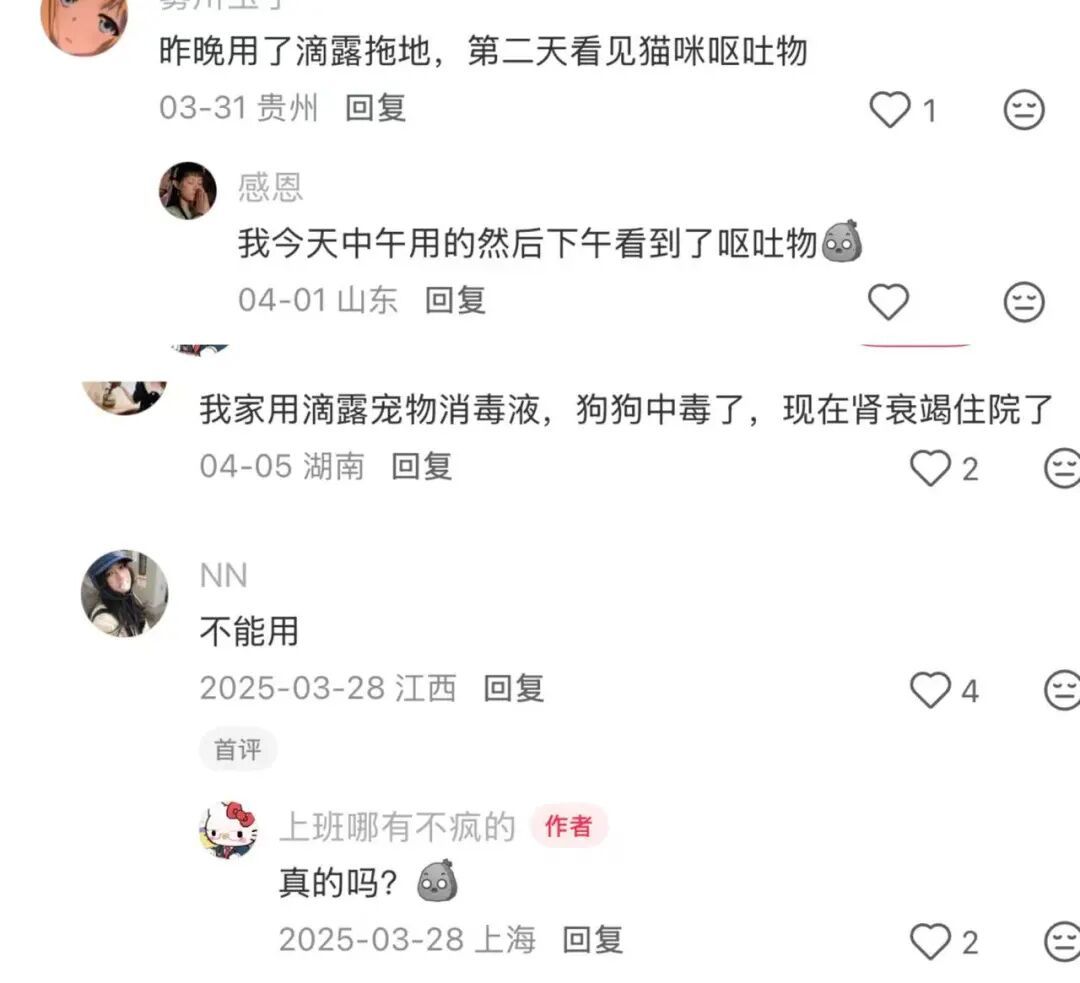 当晚,界面新闻查阅多个社交平台发现,有多位养宠人士发文表示,在使用滴露宠物专用消毒液后,家中的猫出现了呕吐现象。还有消费者表示,在使用该款消毒液后,家中的狗中毒了,“现在肾衰竭住院了。”