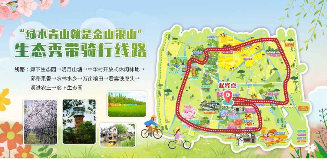 据了解,该骑行路线以廊下生态园为起止点,串联明月山塘、中华村开放式休闲林地、邱移果香、农林水乡、万亩粮田、君宴铁廊头、溪进农庄等节点,全程约18公里,慢速骑行一圈约需1小时。