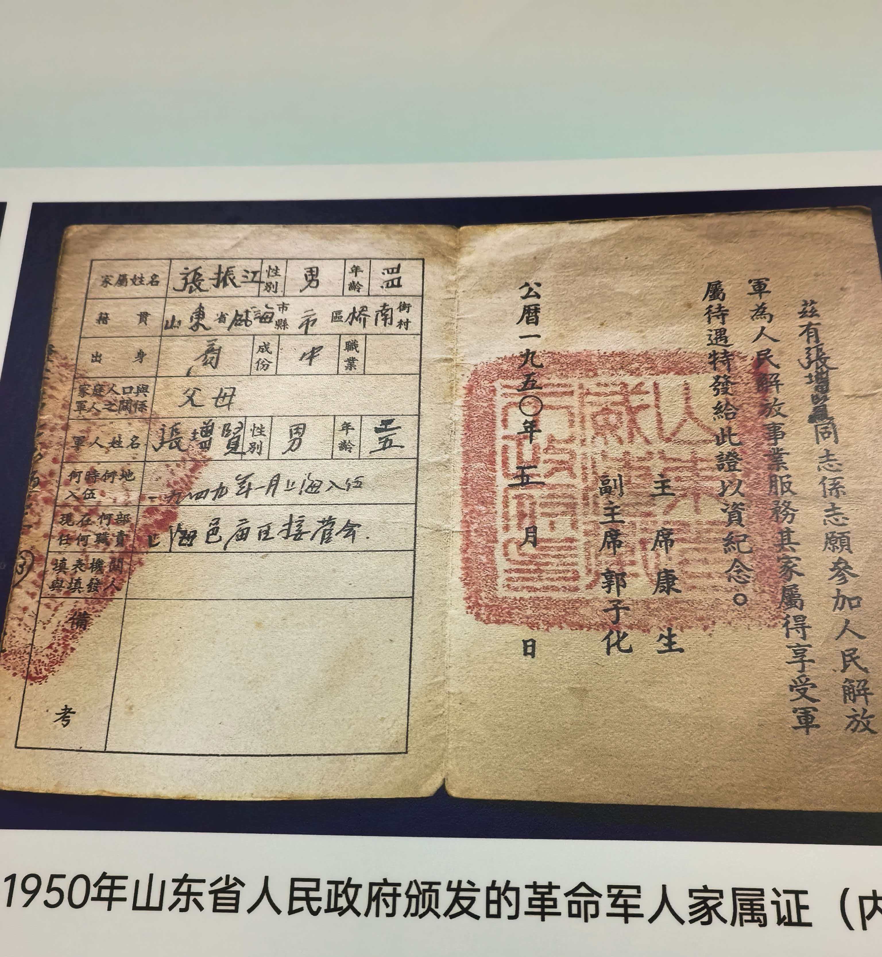 那张1950年由山东省人民政府颁发的革命军人家属证,见证了一个家庭的牺牲与荣光:“兹有张增贤同志系志愿参加人民解放军,为人民解放事业服务,其家属得享受军属待遇。”
