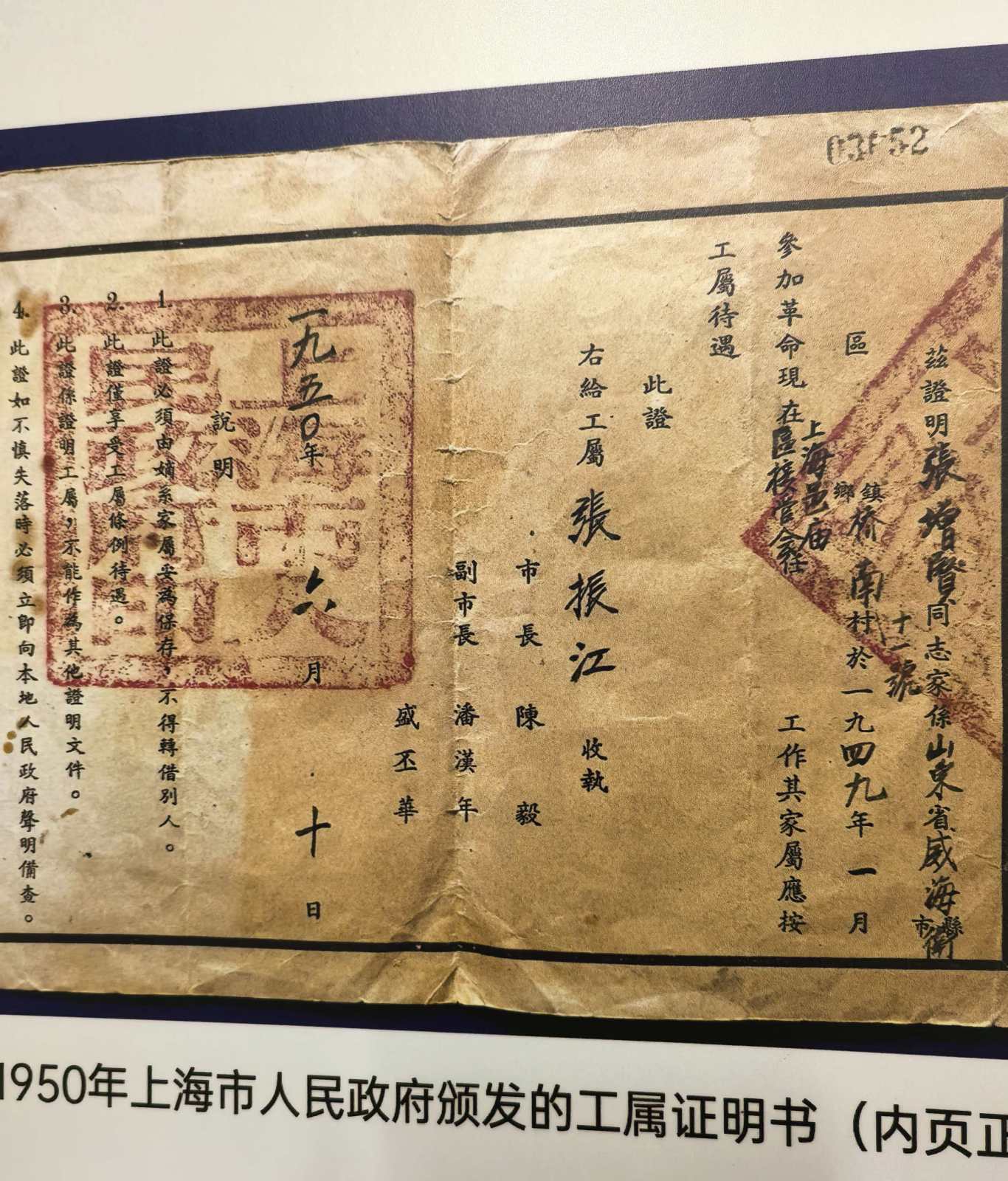 从陈毅签署的任命书,到山东省人民政府负责人签发的军属证;从陈毅、潘汉年签署的工属证明,到威海市的人大当选证书——这些泛黄的纸片,承载的不仅是一个家庭的荣耀,更是一个时代的温度。它们见证了新中国初创时期的政权建设,记录了地下工作者、南下干部群体的奋斗历程,也留存了上海城市变迁的珍贵印记。而张增贤、张利宝、张振江这些名字,或许并不为大众所知,但他们同样是那个火热年代的亲历者、建设者。