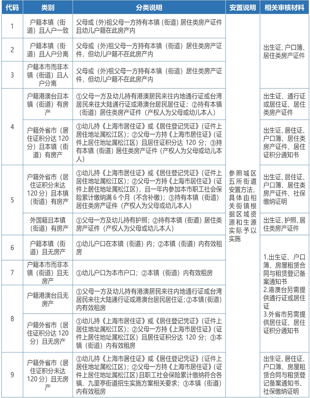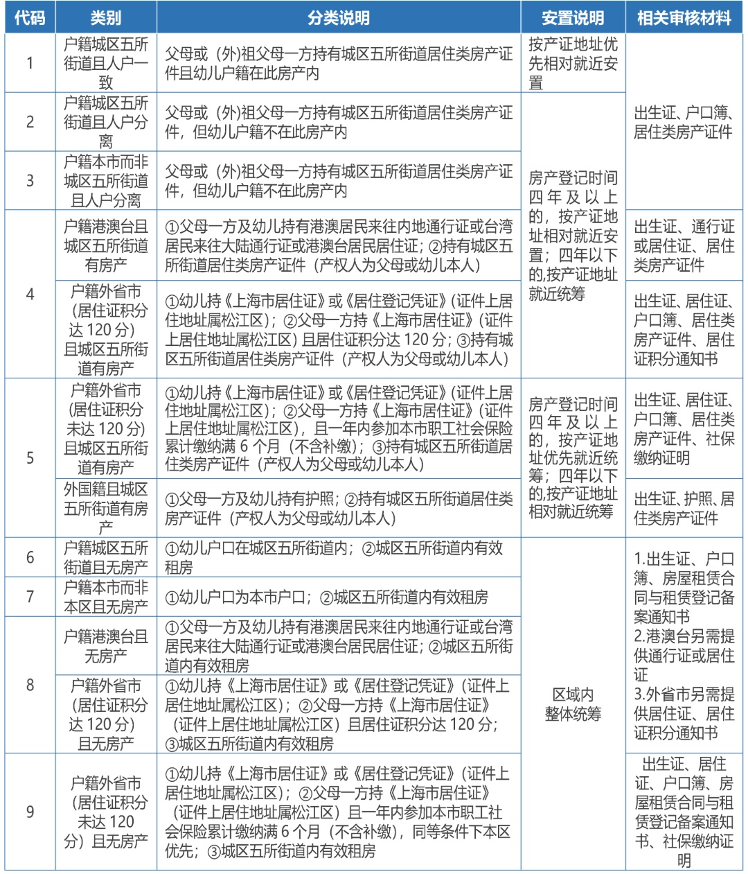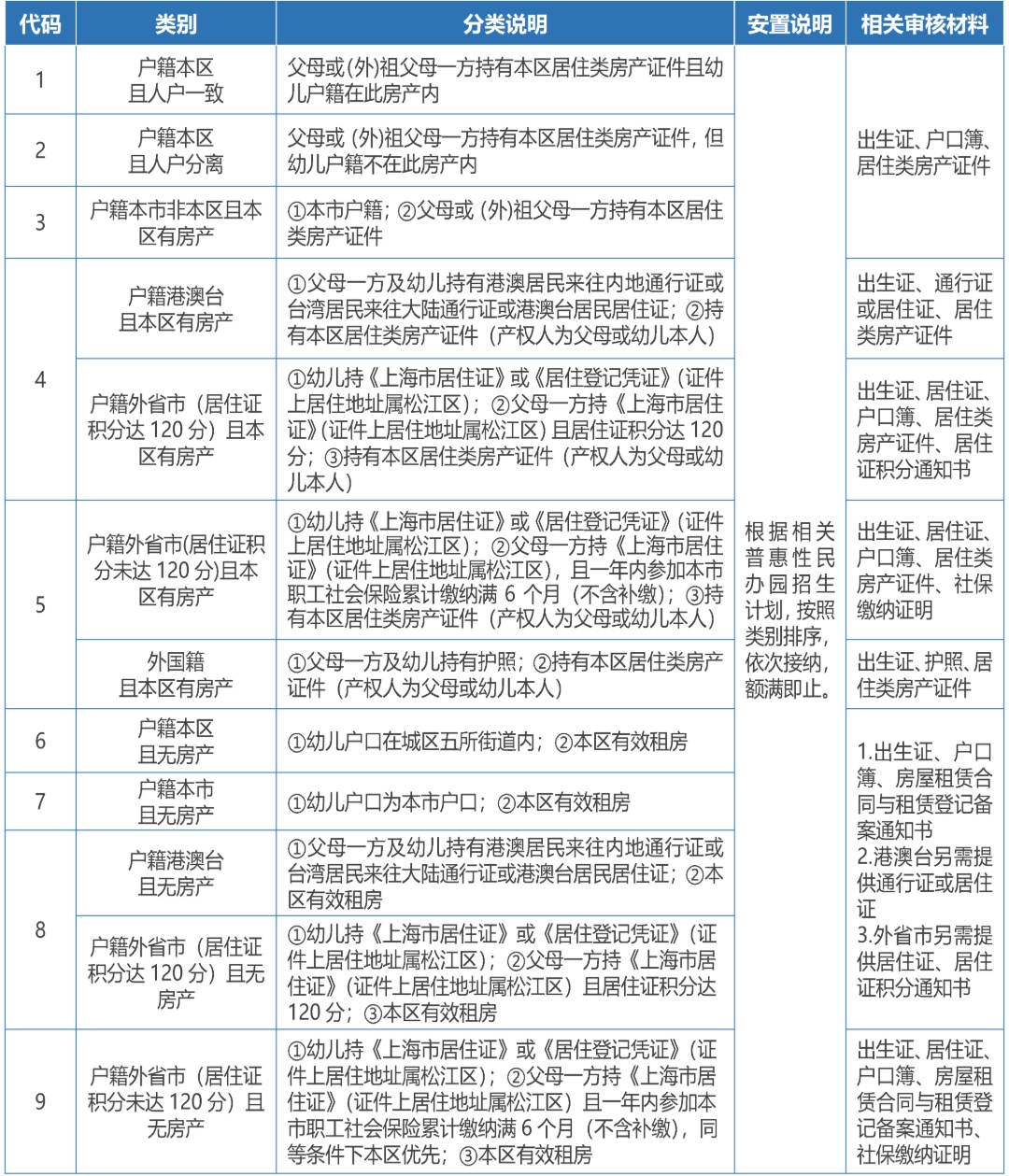 1.上述代码为6、7、8、9的无房产类别,在本区租房的须提供房屋租赁合同与《上海市居住房屋租赁合同登记备案通知书》。公办园根据区域公办资源和生源等实际情况在区域内统筹安置;普惠性民办园根据招生计划依次接纳,额满为止。